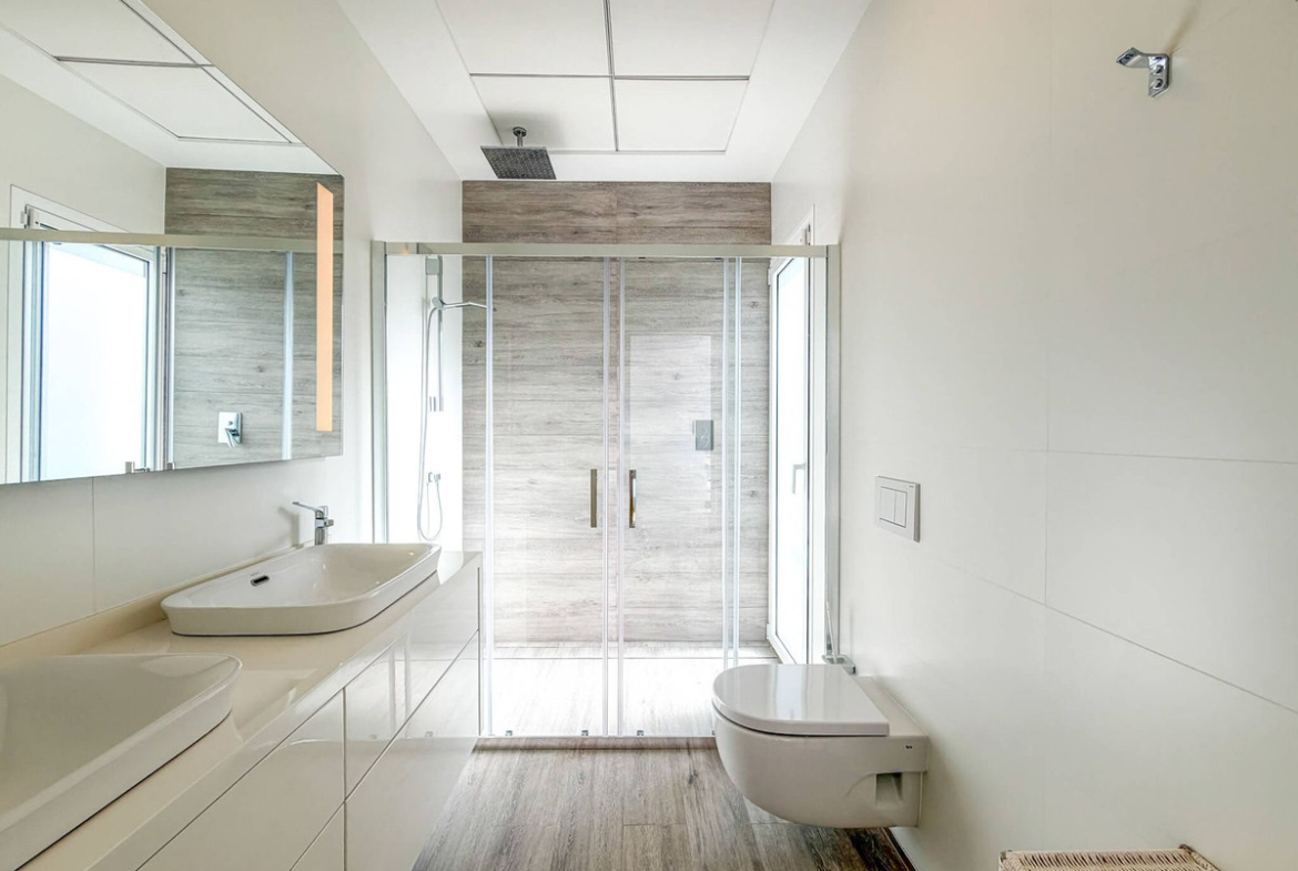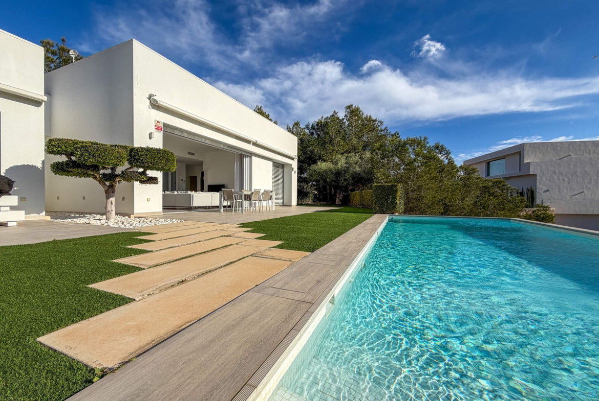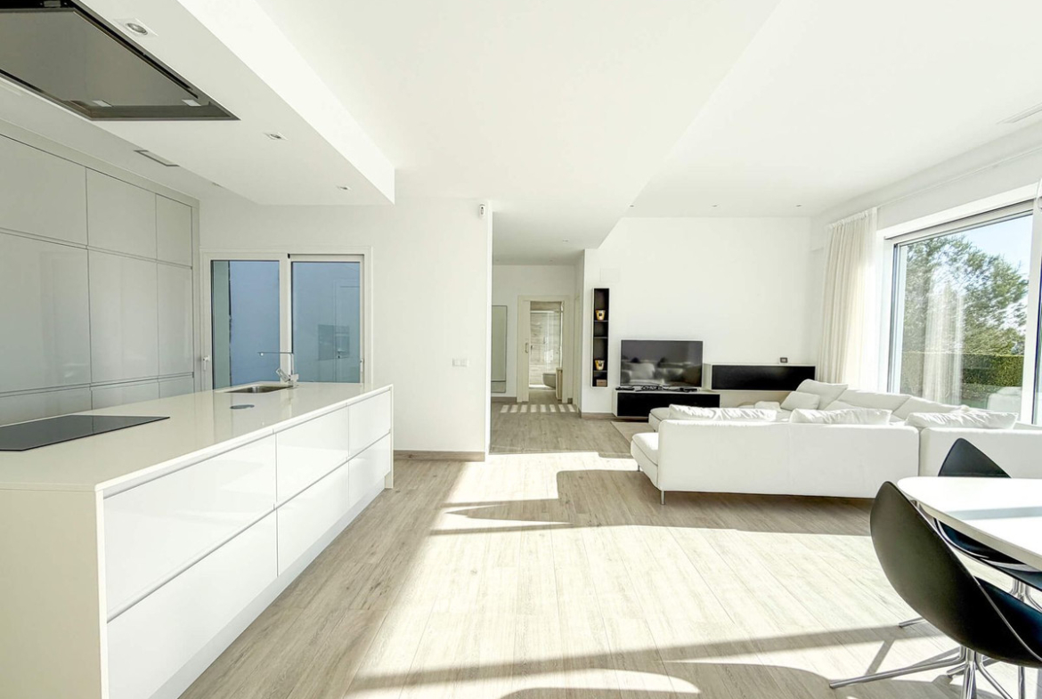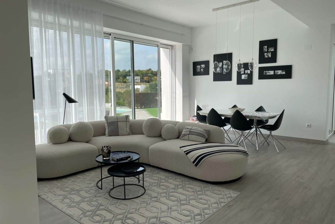 With 3 spacious bedrooms, 2 modern bathrooms, a fully equipped kitchen, and a terrace with a garden and private swimming pool, this villa embodies contemporary architecture with high-quality finishes. Large windows allow an abundance of natural light to flow in, offering breathtaking views of the Mediterranean Sea and enabling an optimal connection between the interior and the exterior.