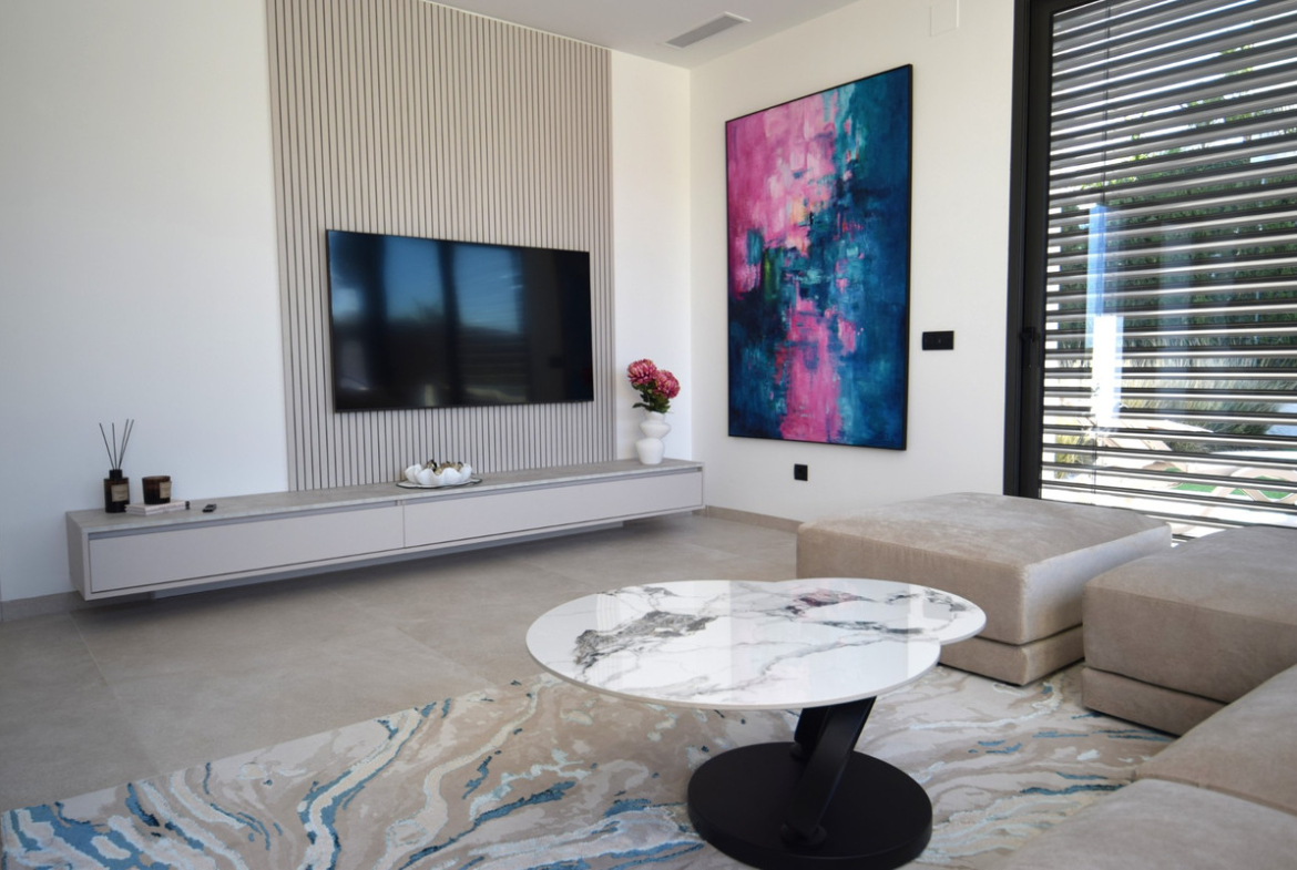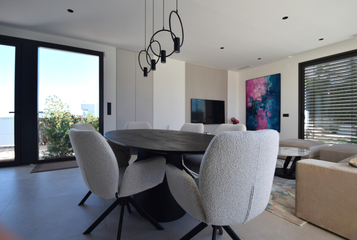 The villa offers 3 spacious bedrooms and 2 elegant bathrooms, finished in a soft, neutral colour palette that enhances the abundance of natural light and creates a calm, sophisticated atmosphere throughout the property.
