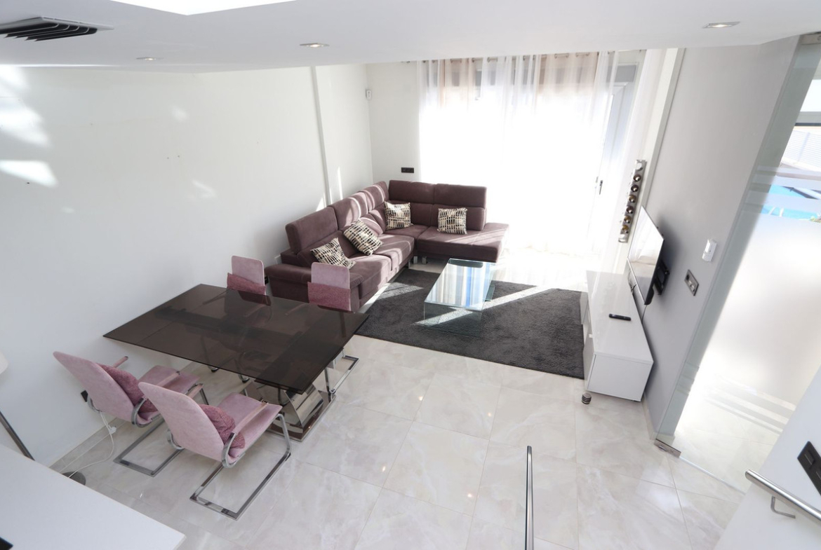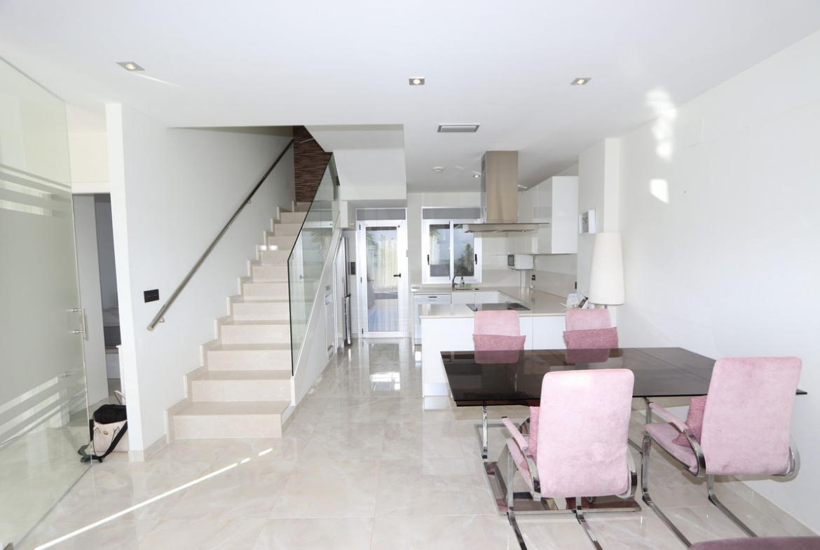 This newly built resale property features three bedrooms with fitted wardrobes, three bathrooms, a spacious living/dining area, and a fully fitted kitchen. Additional benefits include air conditioning, private terraced areas to the front and back, off-road parking, underfloor heating in living area and bathrooms, electric blinds, and solar panels for electric. The property benefits also from a private swimming pool.