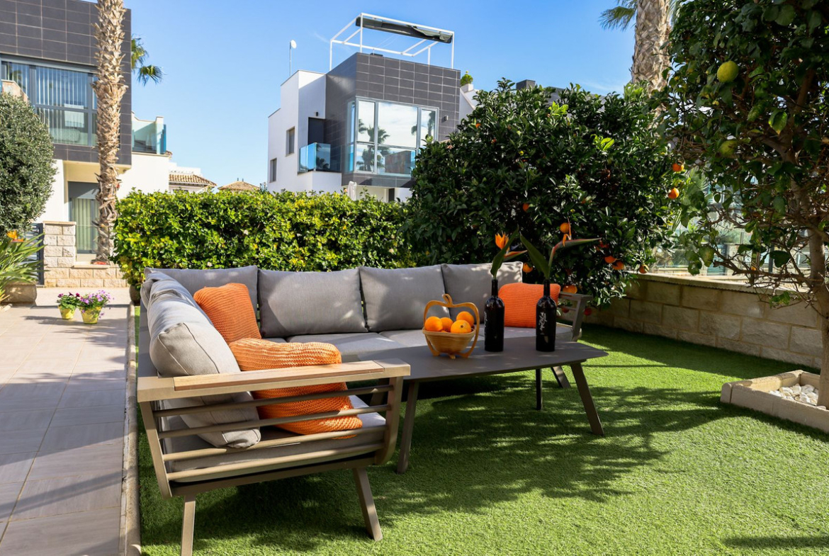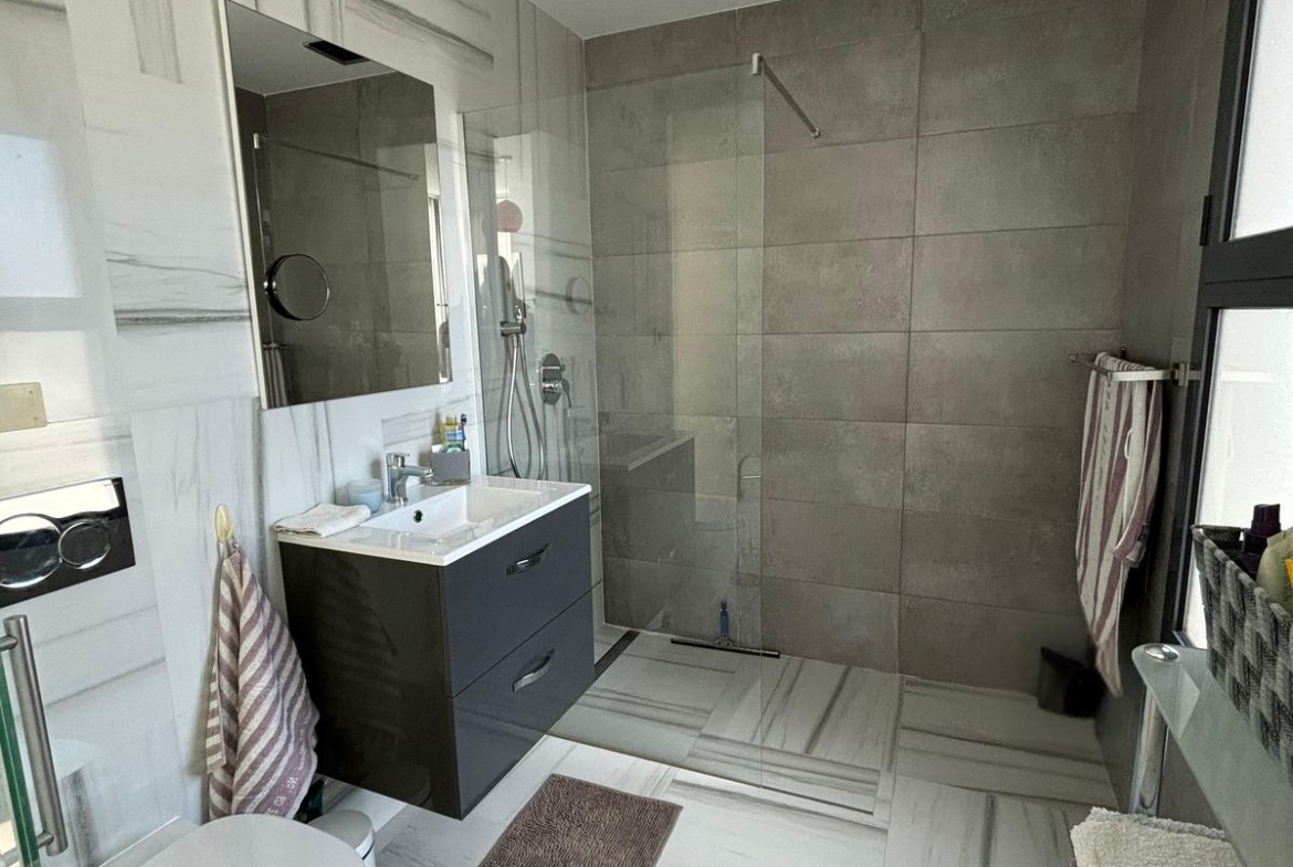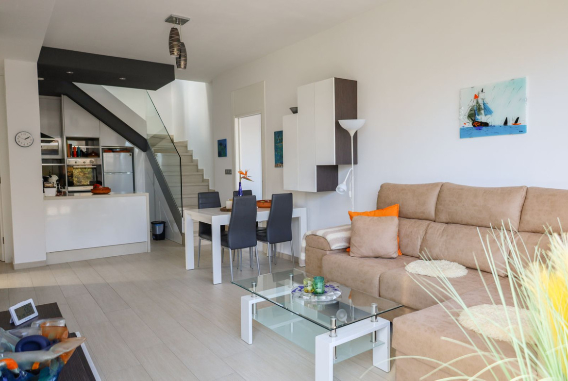 This modern semi-detached home offers an elevated and peaceful setting with open sea views and a prime position just steps from one of two communal swimming pools. Designed for comfortable, contemporary living, the property features three bedrooms, two bathrooms, and a bright solarium ideal for relaxing or entertaining.