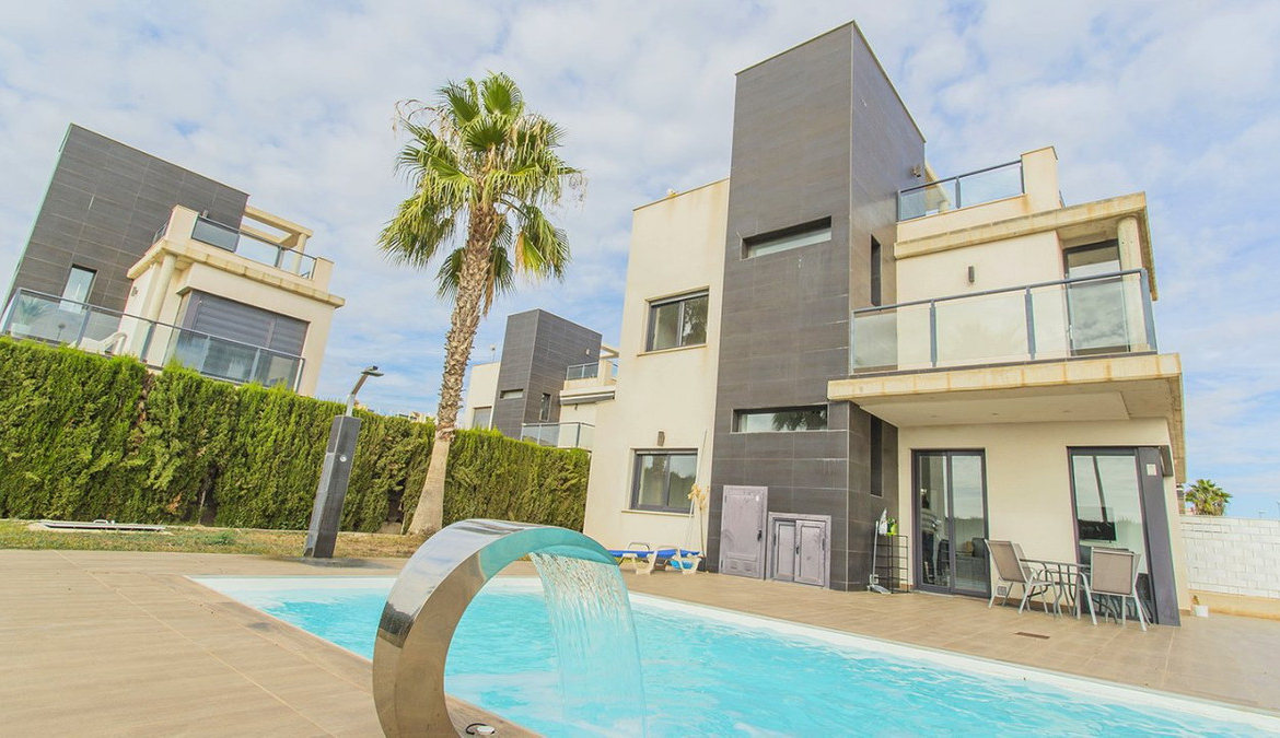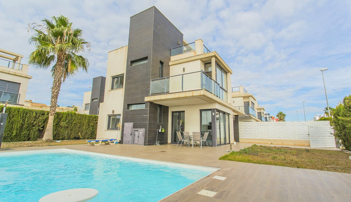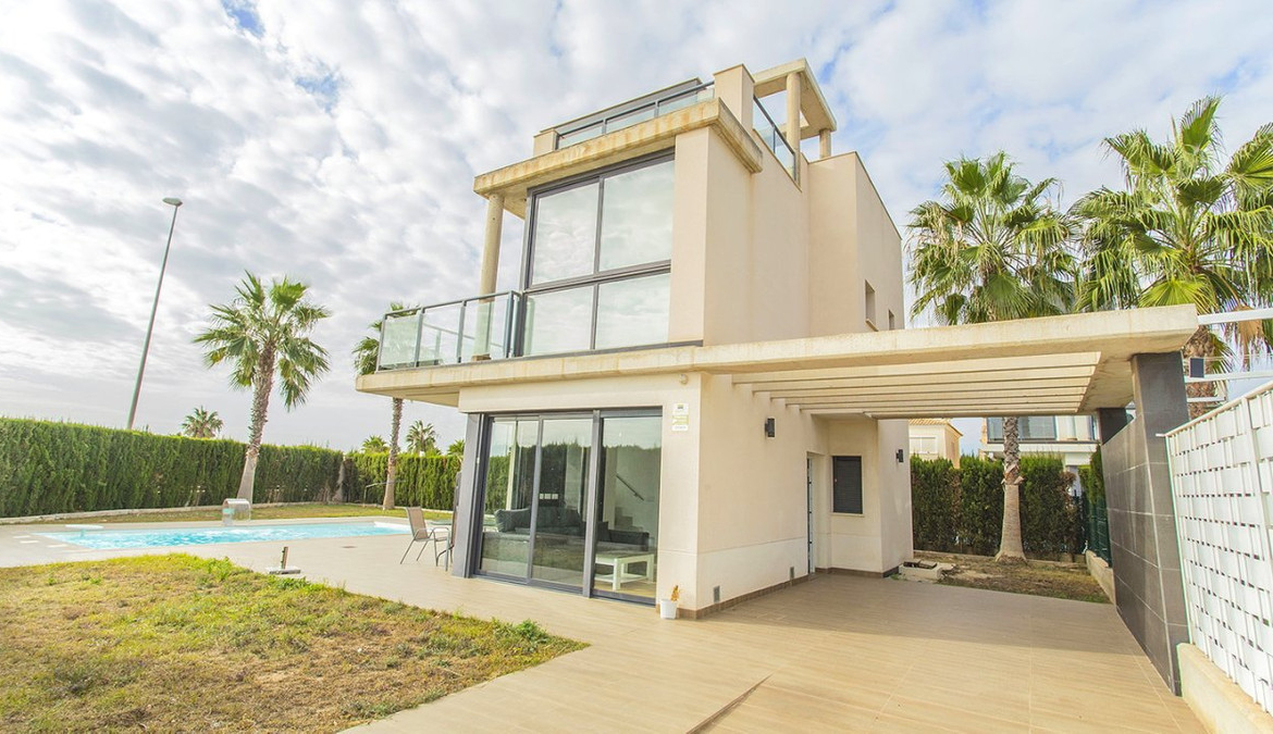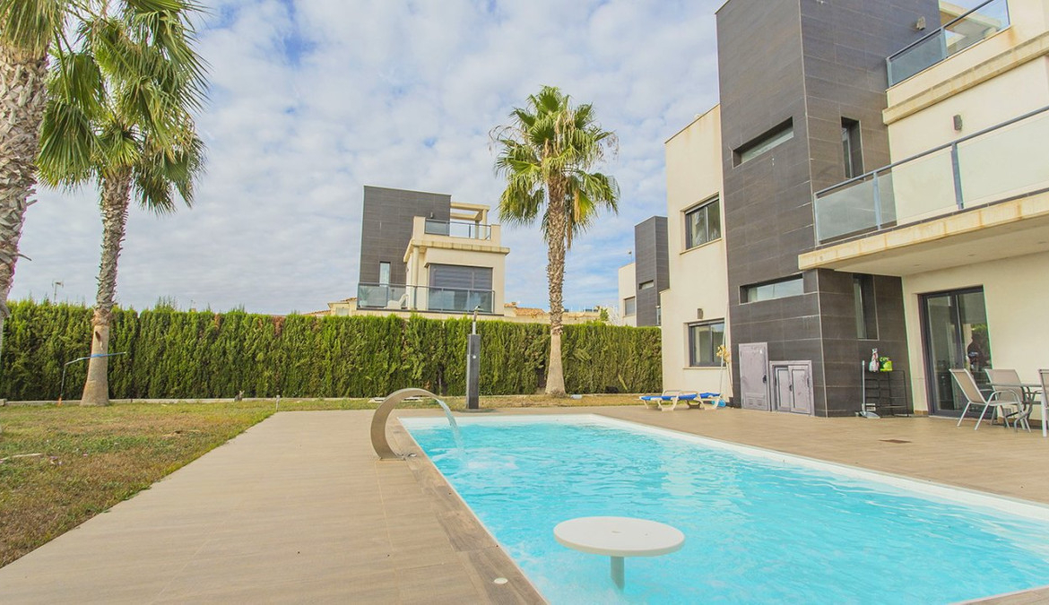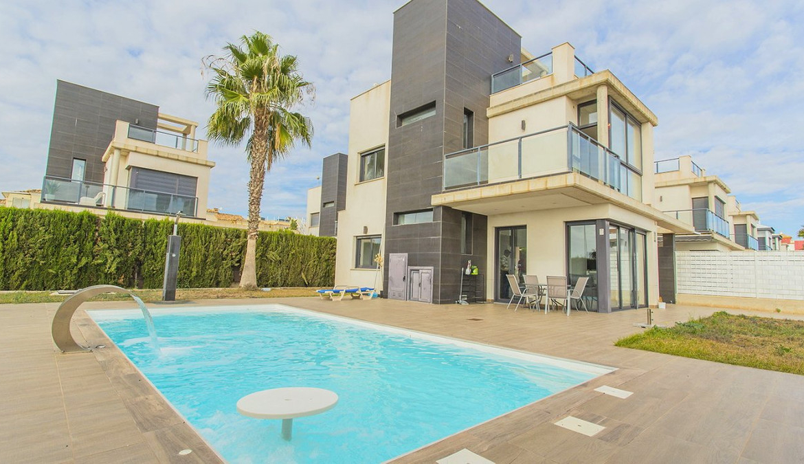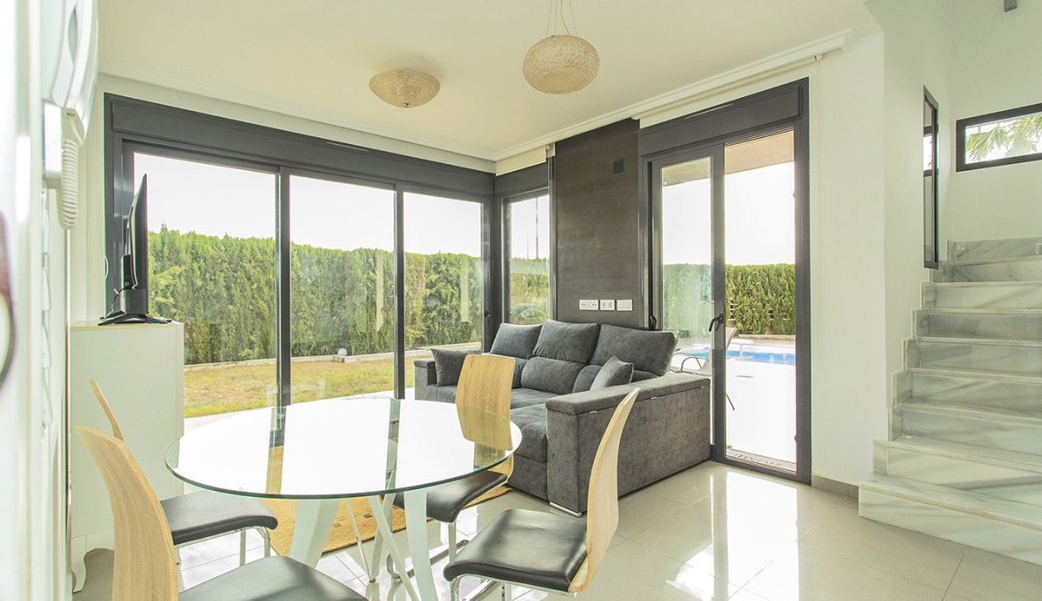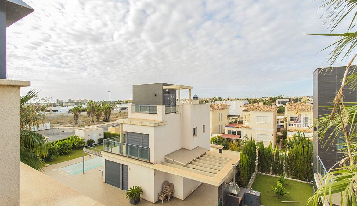 Unique villa with 3 bedrooms and 3 bathrooms, distributed on two levels. On the first floor you will find an open kitchen and living room, dining room and en-suite bedroom with built-in wardrobe. It has direct access to the gardens from the living room with large polished sliding doors. On the second floor you will find two en-suite bedrooms with built-in wardrobes. The entire interior of the house is designed and made by interior designers. You will find perfectly matching LED lights, lamps and furniture throughout the villa. The house is also equipped with a video intercom alarm system that can be controlled by app. Outdoor area The villa is located on a 500 m2 plot. In the beautiful garden you can find a swimming pool with plenty of space for sun loungers. The pool comes with LED lights. In the garden you will also find a barbecue area. The villa is part of a private, gated community that offers a high degree of security to its residents. There is parking for one car on the plot. Surroundings The villa is located in the exclusive area of Lomas de Cabo Roig in Orihuela Costa. You will find bars, restaurants and grocery stores just around the corner. You will also find the popular golf courses of Campoamor, Villamartín and the award-winning Las Colinas golf course just a few minutes drive away. La Zenia Boulevard, the largest open-air shopping center in the province of Alicante, is just a 15-minute walk away. Here you will find stores such as Zara, AlCampo, H&M, Decathlon, Primark, Medimarkt among many others. You'll also find a variety of beautiful beaches just a few minutes' drive away.