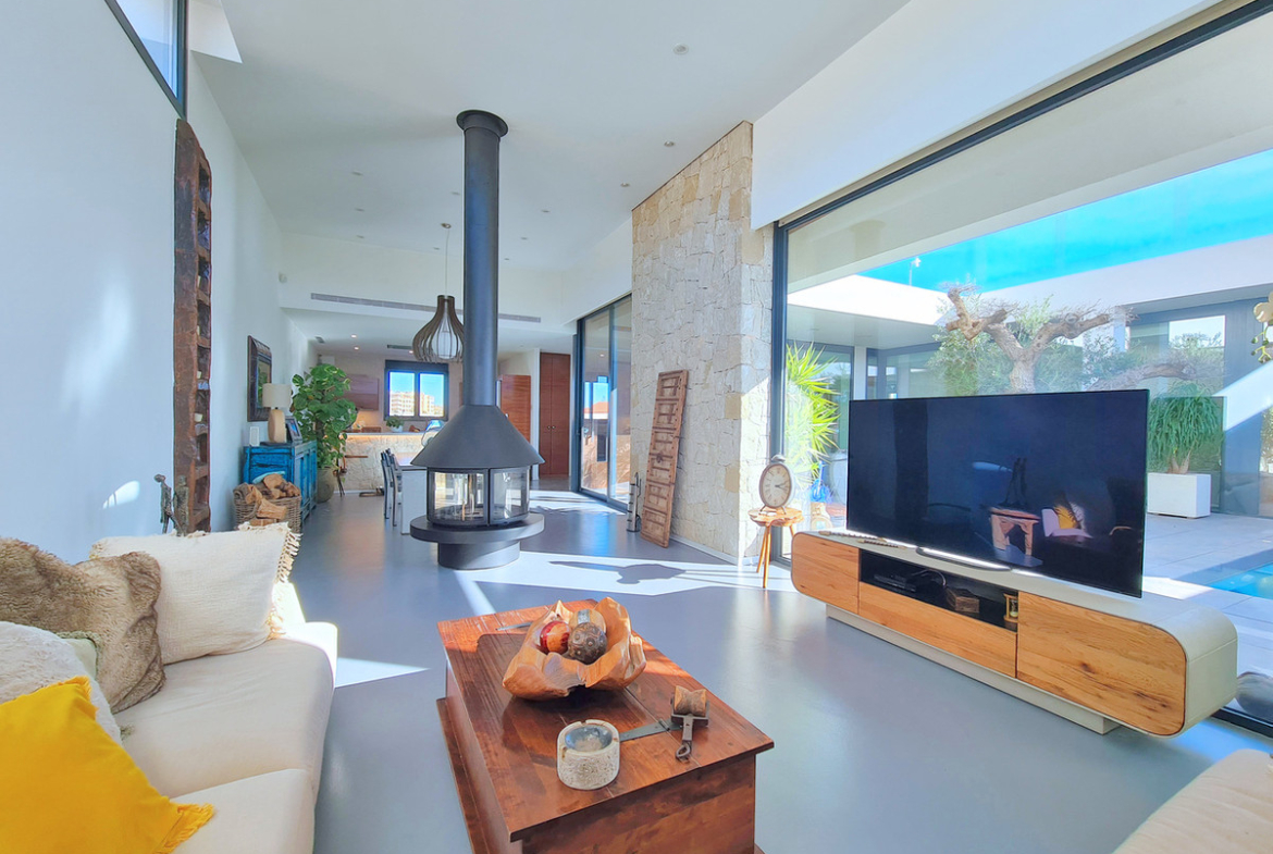 The villa features heated flooring throughout, vented air conditioning and heating as well as a log burner fireplace. An air filtration system removes dust and provides fresh and clean air throughout the property continuously. The kitchen cupboards open and close electrically, with a touch. The villa has its own high pressure water pump ensuring that the showers give a strong current throughout. Hand carved wooden doors and electric blinds and shutters feature throughout the property as well as industrial LED lighting which illuminates the home at night.