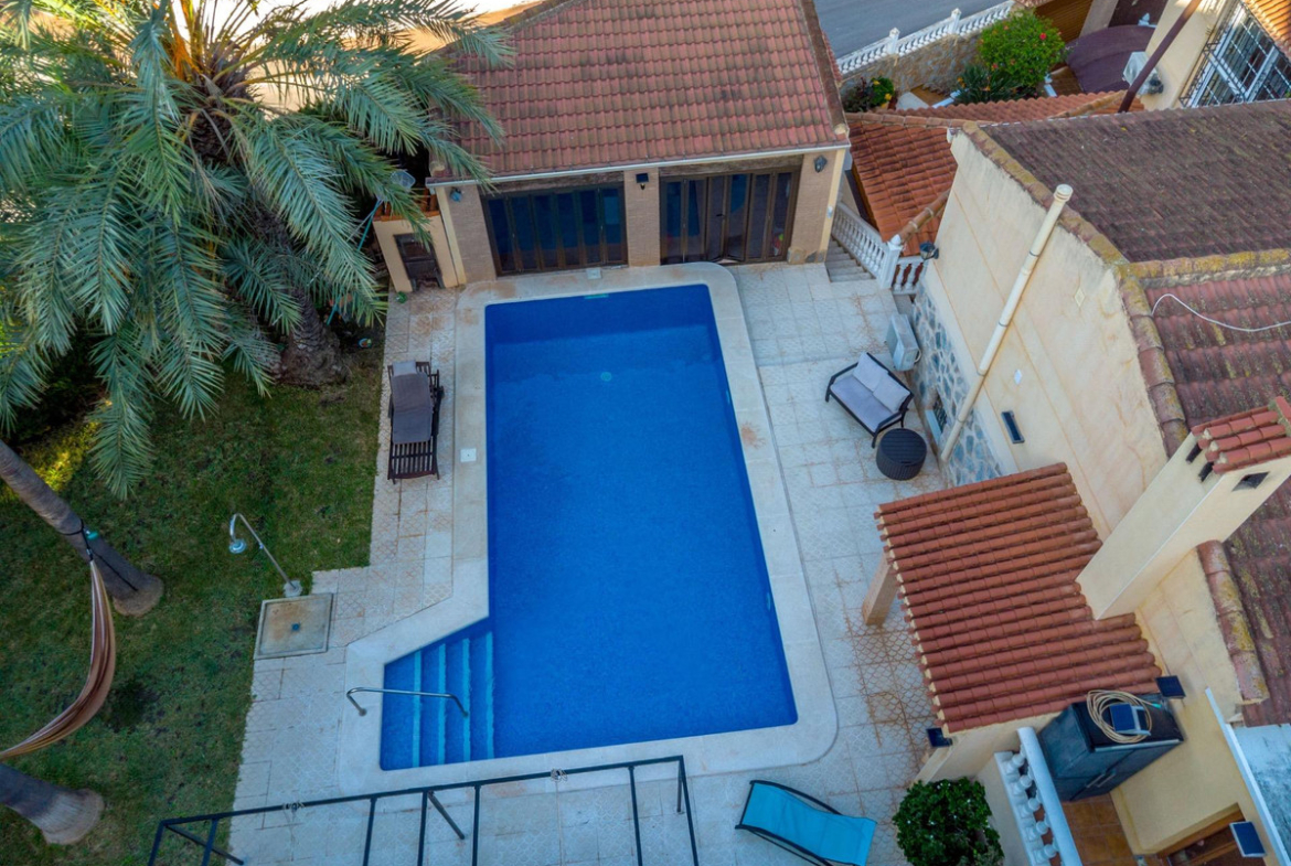 Detached villa with private pool and large plot in Los Balcones~~Detached villa with a spacious plot, private pool and wellness area, ideal for year-round living.~~The property has an approximate built area of 200 m² and stands on a plot of more than 800 m², located in the prestigious residential area of Los Balcones — a quiet and well-connected area of Torrevieja.~~It offers three bedrooms and three full bathrooms, along with a bright living room and an independent kitchen. All rooms are equipped with heating by radiators (diesel boiler) and air conditioning via split units.~~Outside, the villa features a large garden area with a private pool, a glazed winter room, and a sauna area — perfect for relaxation and comfort.~~There is also a closed garage with space for two vehicles.~~A well-maintained and complete property offering privacy, space, and excellent quality, ideal as a permanent home or as a holiday residence.