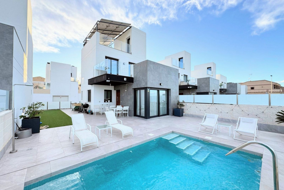 Take a look at this Fabulous New Build Resale Detached Villa located in Los Balcones. The property offers 3 spacious bedrooms with wardrobes, 3 bathrooms, living/dining area and a fully fitted kitchen. On the ground floor you will find a bedroom with ensuite bathroom and walk-in closet and on the upper floor a further 2 bedrooms and bathroom. The property benefits from terraced areas, roof solarium with views of the salt lakes, underfloor heating, solar panels and a 70 m² basement with a garage and plenty of storage for bicycles or sports equipment. The property also benefits from a private swimming pool, outside shower, air conditioning and much much more.