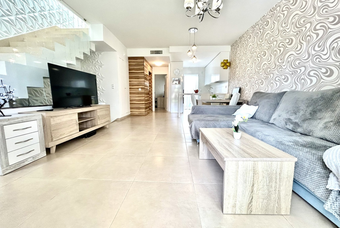 Upstairs, both bedrooms benefit from en-suite bathrooms. The master bedroom enjoys direct access to a private balcony with lovely open views, as well as access to a rooftop solarium—an ideal spot for sunbathing or relaxing while taking in the surroundings. The second bedroom also boasts its own private outdoor space, adding to the home’s appeal.