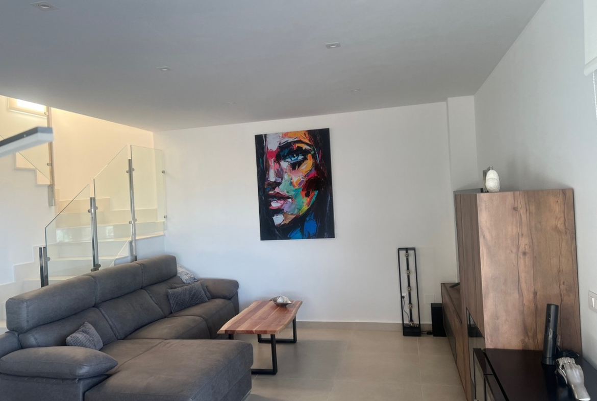 The property consists a spacious living/dining room, a modern open plan kitchen, three bedrooms with fitted wardrobes, three bathrooms (two are en-suite). Upstairs, the master suite offers plenty of space, an en suite bathroom with dressing room and a private terrace with breathtaking views – ideal for relaxing. All windows with electric shutters, underfloor heating in the bathrooms. Electric shutters and awning with sensor, fully equipped outdoor kitchen with induction cooker, extractor hood, refrigerator and freezer, as well as grill. Large private swimming pool with fully automatic salt system with Redox and automatic filling. Pool heating/cooling so you can swim at 30 degrees all year round. Special filter for drinking water throughout the house, solar on the roof with inverter/battery and feed into the grid. Electric gate with remote control and space for 3 cars. Whirlpool, furniture etc. may be taken over. (Negotiable)