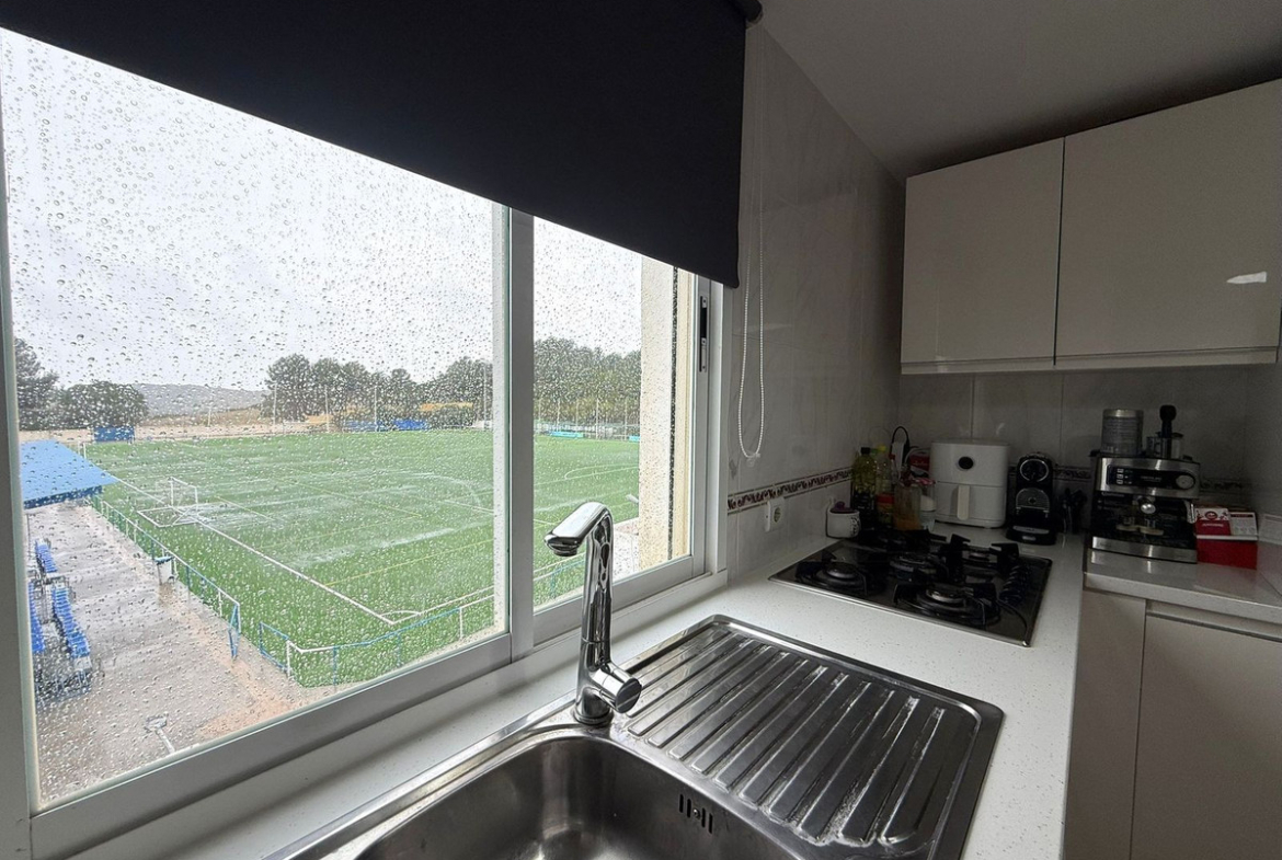 The kitchen enjoys open views over the football field, providing natural light and a pleasant sense of space. It also includes a separate laundry area, adding extra practicality to daily living.