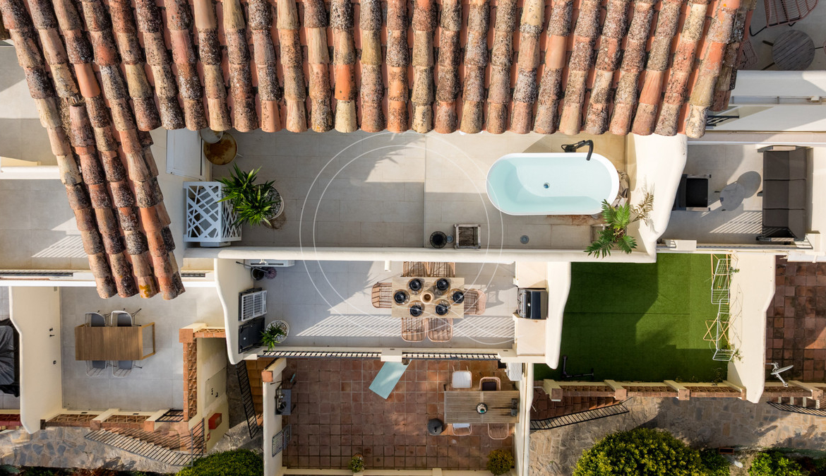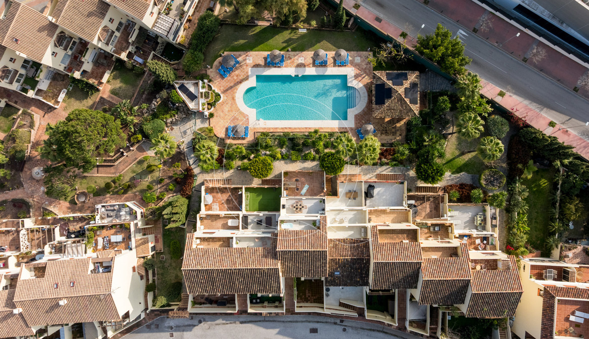 This renovated townhouse in Pinos de Aloha combines modern comfort with Mediterranean charm. Located in a quiet residential area near Aloha Golf Club, it offers a peaceful setting while being close to Puerto Banús, shops, and international schools, including the prestigious Aloha College.