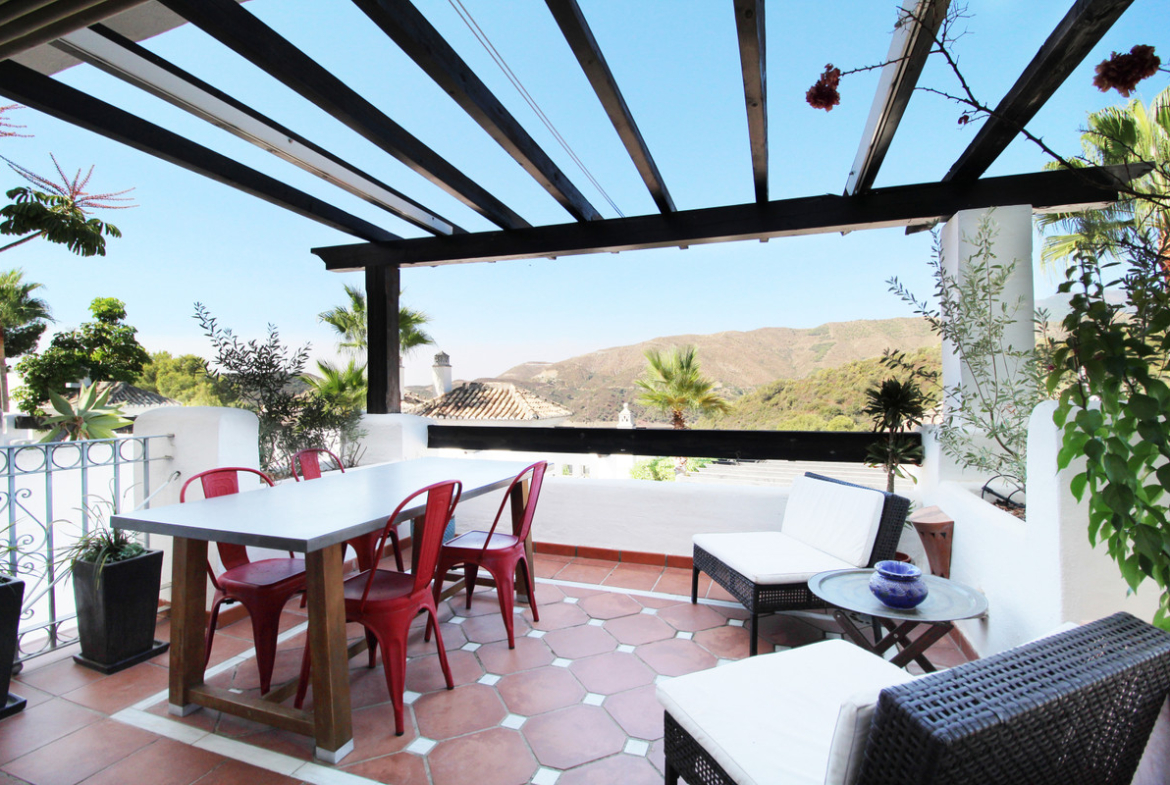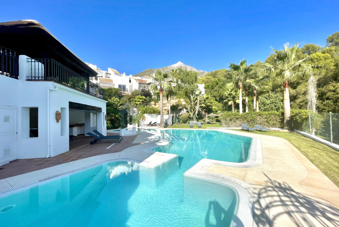 Situated just 9 mins from the Golden Mile and 10 into Puerto Banus, this is a small, unique development of just 59 townhouses, nestled into the foothills of the La Concha mountain in one of Spain's biggest National Parks and overlooking the Istan lake. Perfect for those looking to get away from the hustle and bustle and yet just a short hop into the centre of it all. This south/west facing house has a spacious and bright living area with windows and patio doors leading out onto two separate terraces, partly refurbished with new bathrooms and the possibility of opening up the large kitchen to the living area. Off the kitchen is an internal patio ideal for a BBQ. The living room leads out onto the elevated terrace from which you look directly out over the stunning mountains and lake. The upper level has three double bedrooms including the master suite which also enjoys those lovely views as does the 2nd bedroom. The 3rd bedroom has access to a small private terrace area. The house has a large basement/garage area with more than enough room for two large cars and storage. The complex itself has a security barrier and is protected with CCTV, there is a lovely and peaceful pool area and gardens close by as well as a children's play area at the far end of the community. The white village of Istan is just an 11 minute drive away and is very popular with cyclists due to its outstanding beauty.