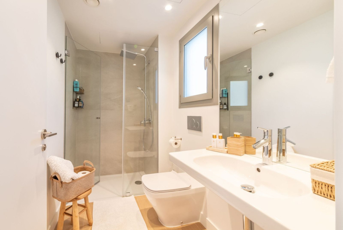Upstairs, you'll find three bedrooms, including a master suite with a private bathroom featuring a shower and bathtub. The other two bedrooms share an additional full bathroom. Two of the bedrooms have access to another large terrace, perfect for soaking up the sun and enjoying the views.