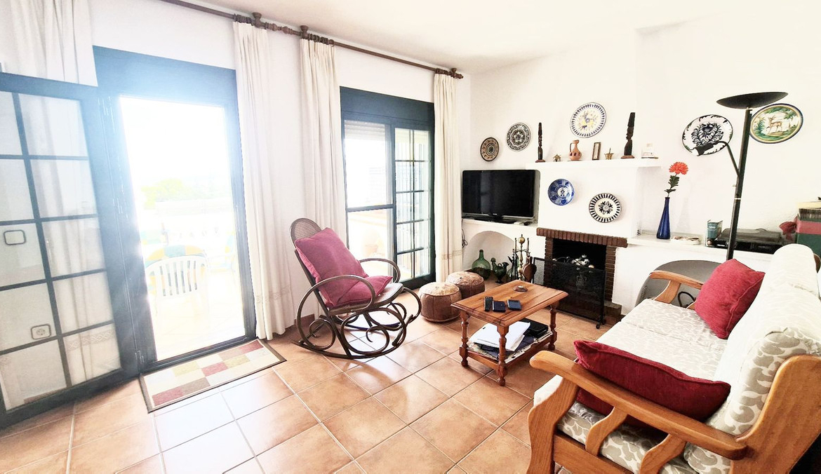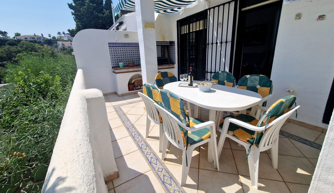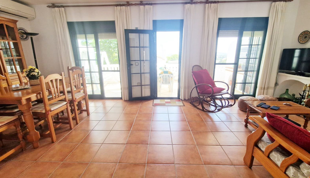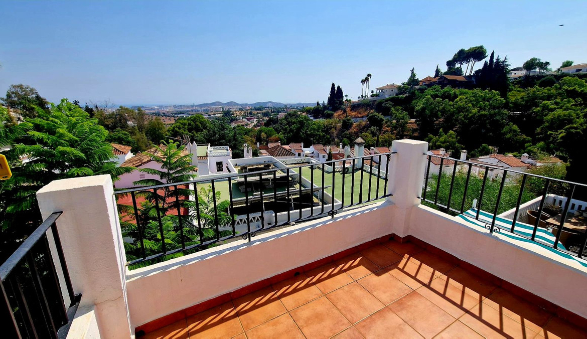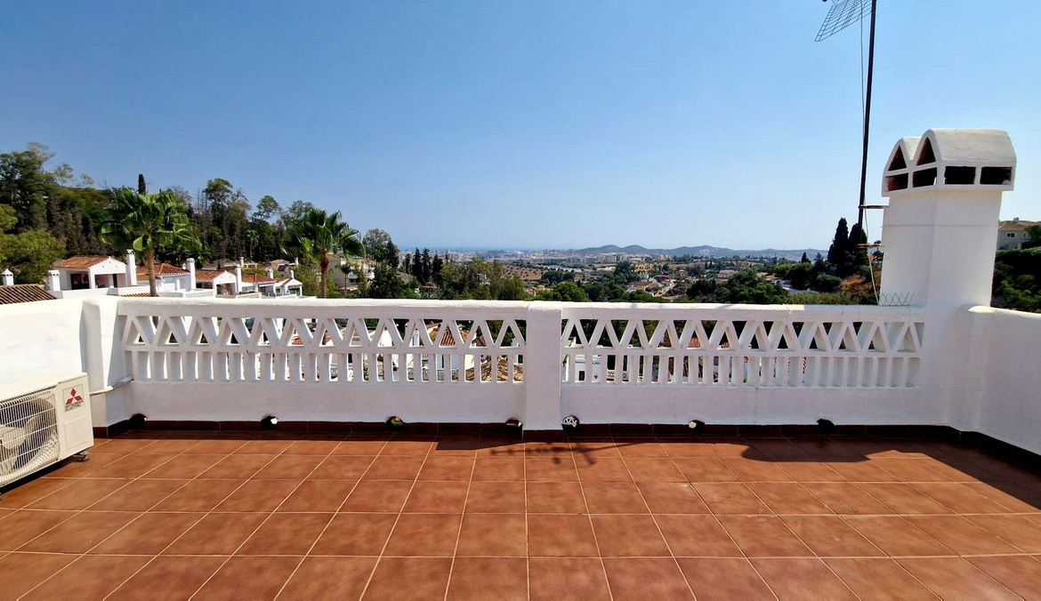 Partially renovated townhouse in Mijas with panoramic views. Spread over 3 floors, it features 3 bedrooms, terraces on every level, a solarium, modern kitchen, and BBQ terrace. Community pool & gardens included. Peaceful location just 5 minutes from town!