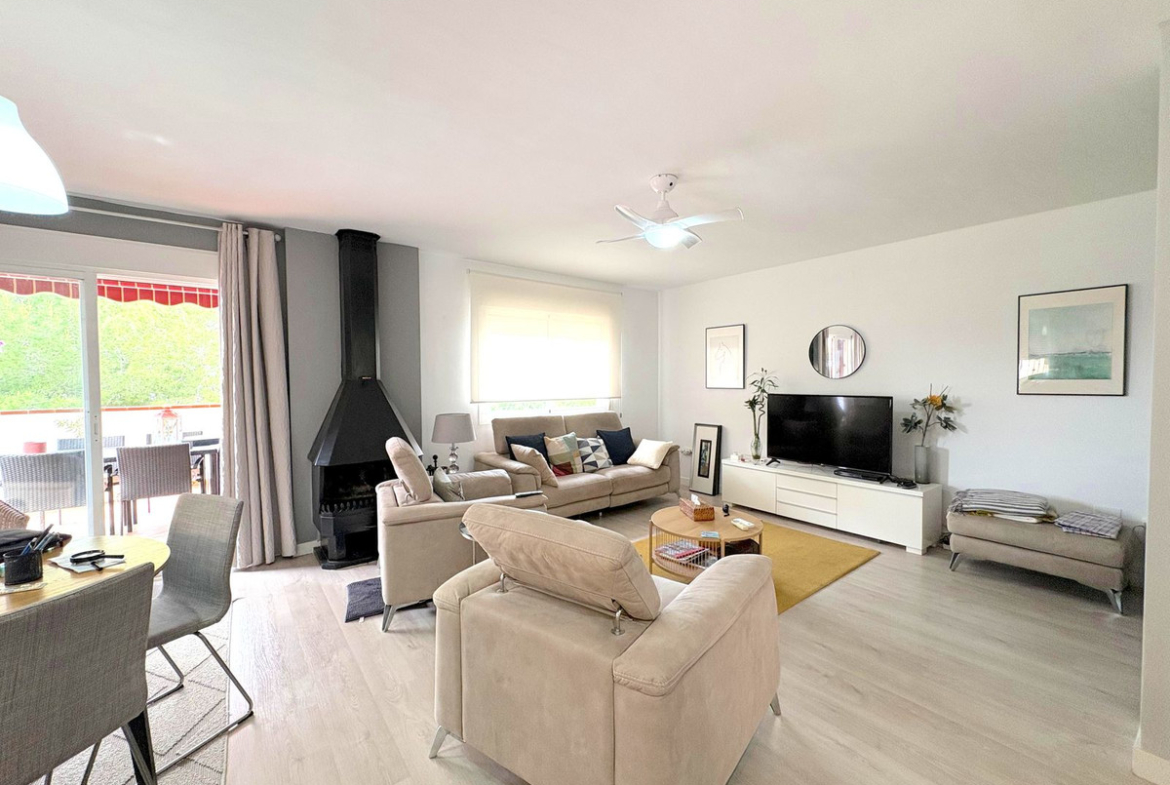 Upstairs, the main floor features a fully fitted open kitchen, a guest WC, and a bright living room complete with fireplace, creating a warm and inviting atmosphere throughout the year.