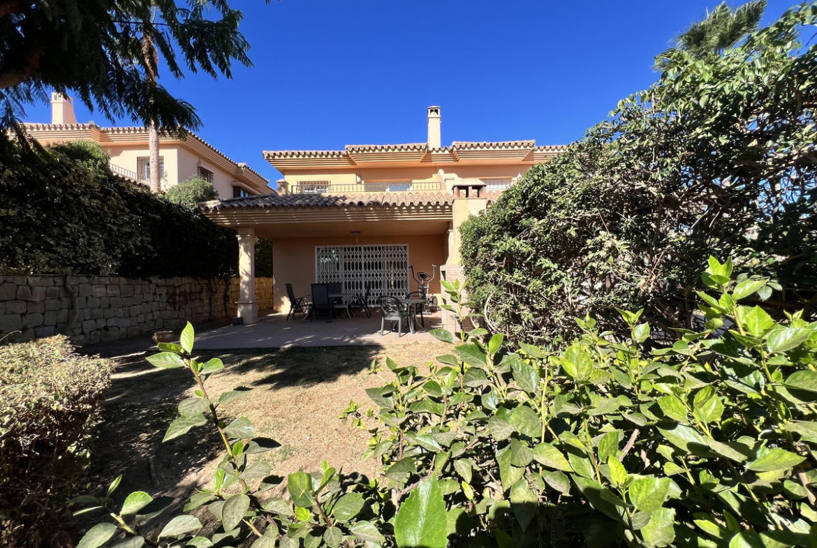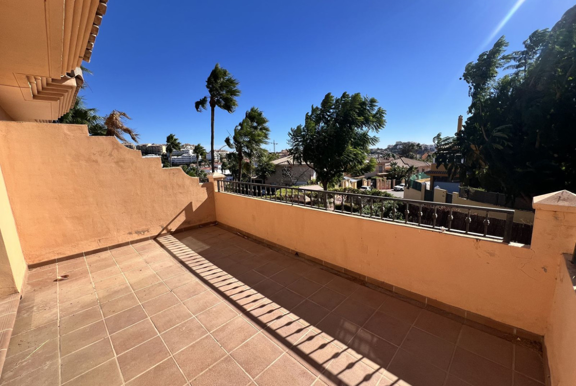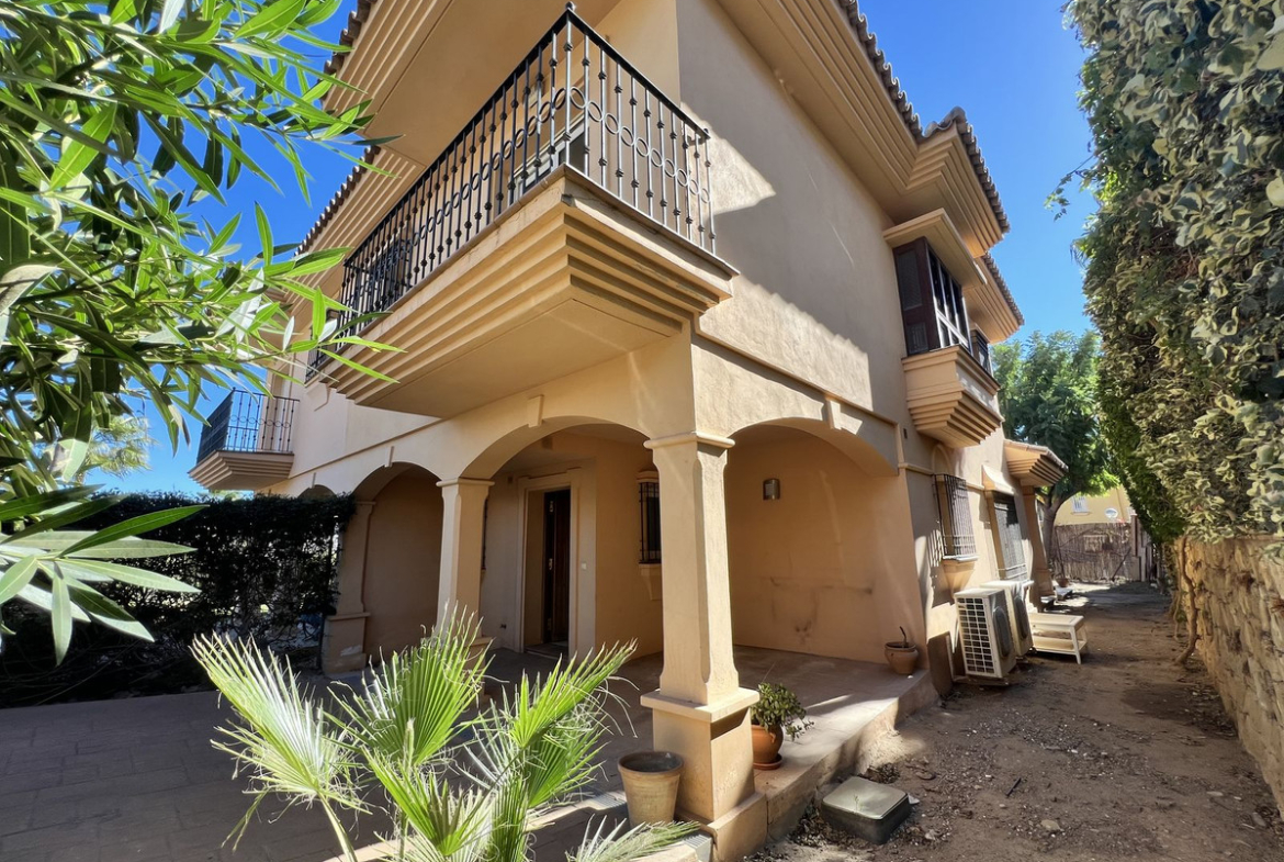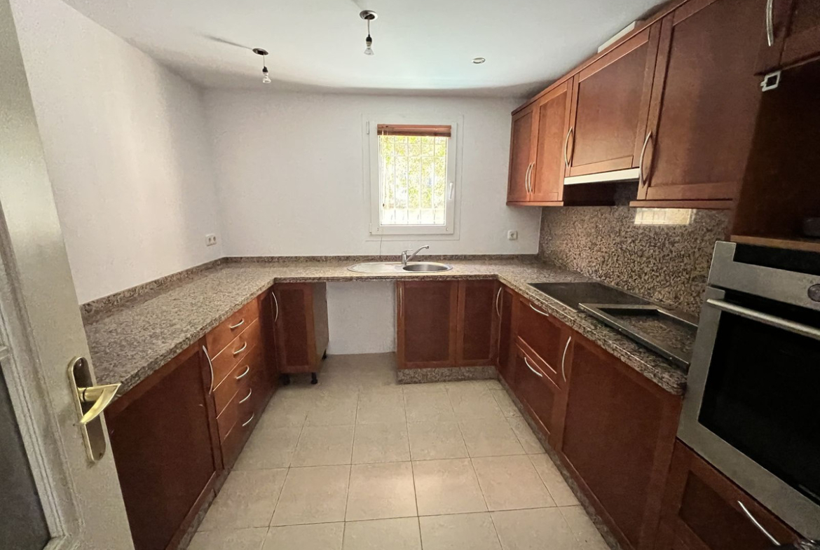 On the ground floor, there is a spacious living-dining area with great natural light, an independent kitchen with the possibility of being opened up to the living room with a minor renovation, a guest toilet, and a separate utility/laundry room. The property features centralized air conditioning and marble flooring.
