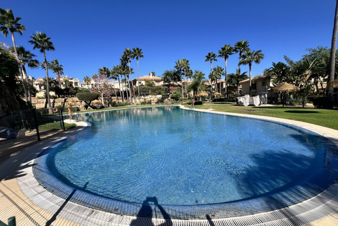 The communal areas include two swimming pools, one of which is open year-round, as well as a barbecue area with tables. Garden maintenance is included in the community fees.