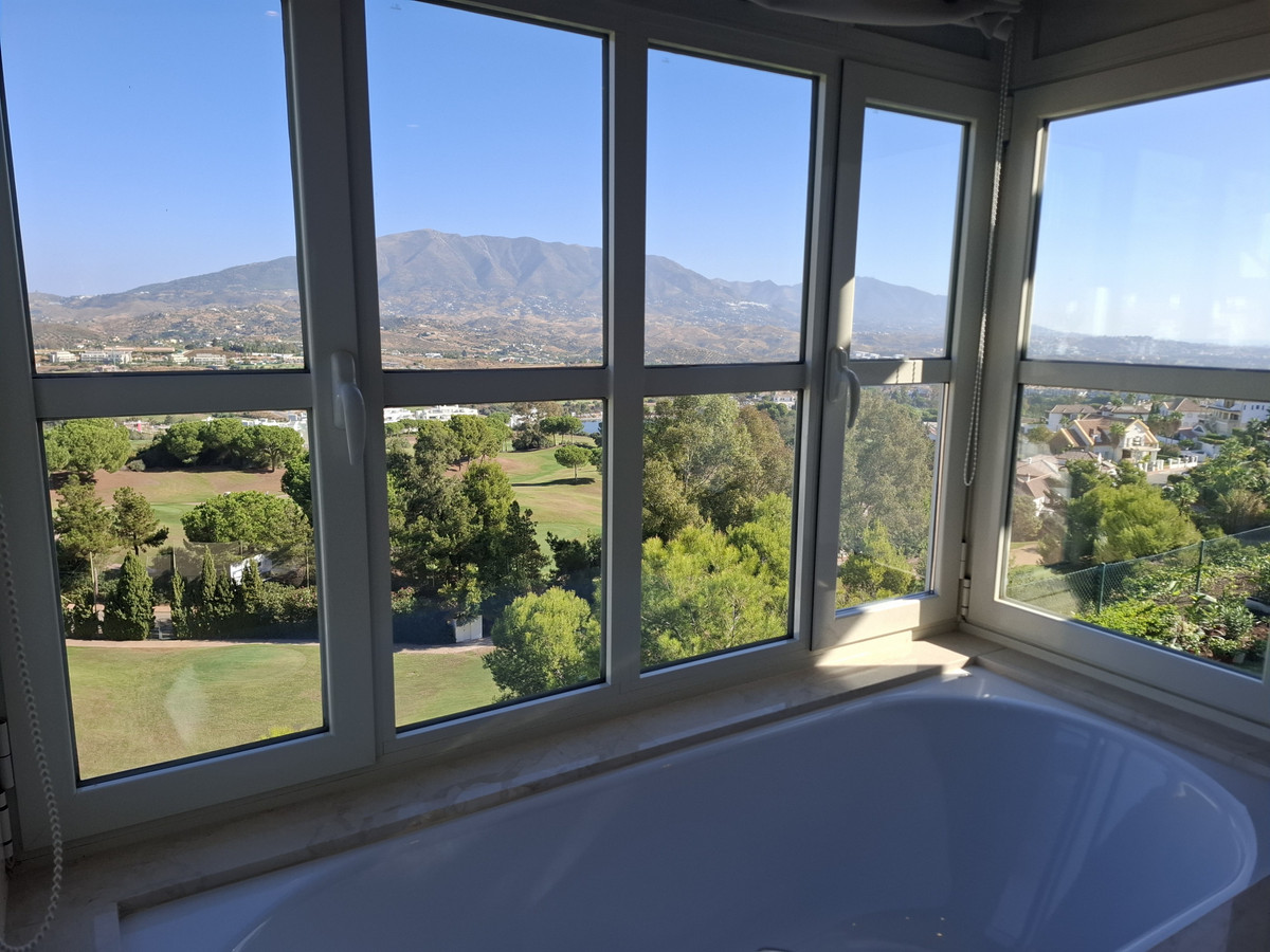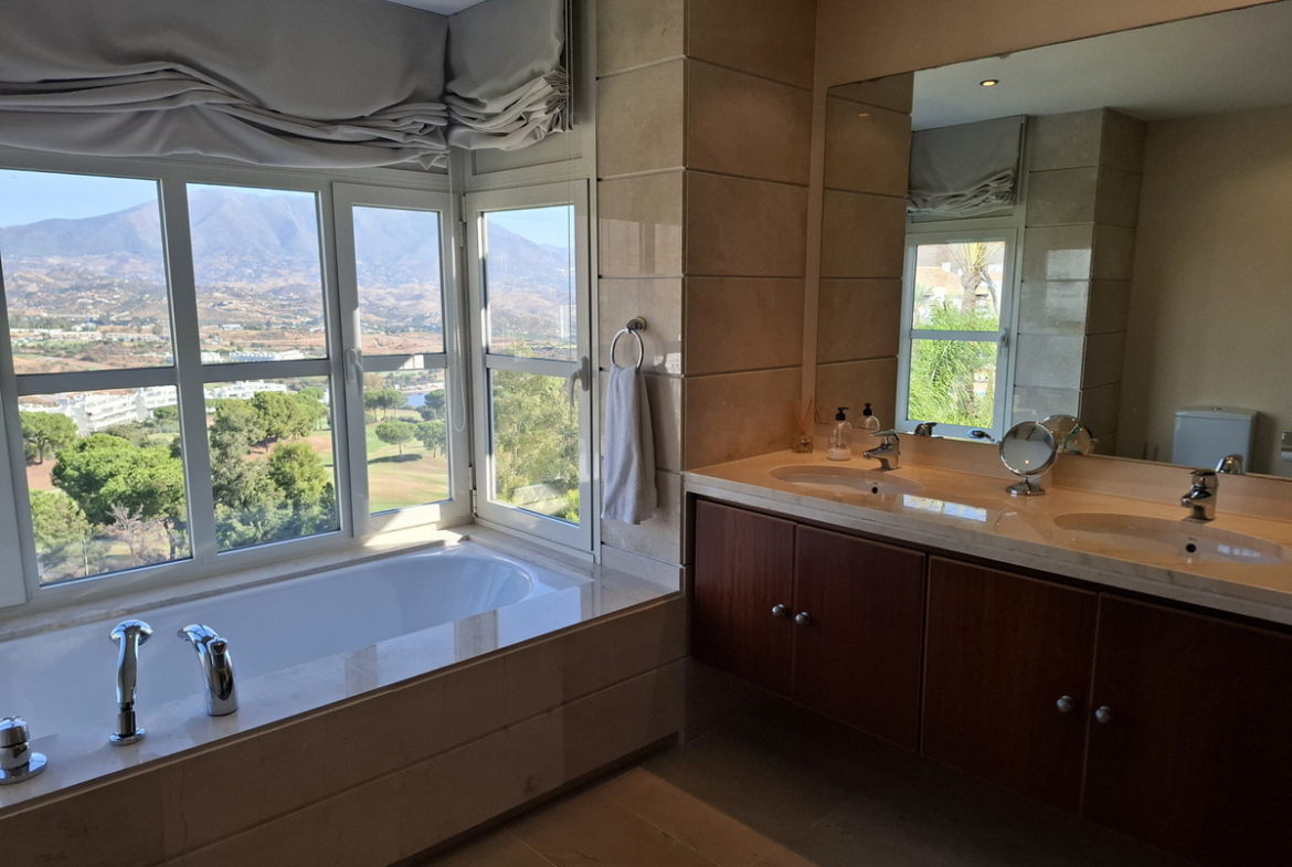 • 3 full bathrooms, with top quality marble tiles, main bathroom with underfloor heating, huge shower and Jacuzzi with Golf and sea views.