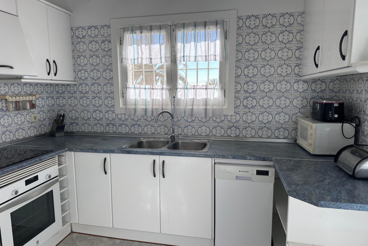 The villa has a built area of approximately 180 m² and is entirely on one level. The living-dining room with fireplace is bright and connects directly to the covered veranda and the pool terrace. The separate kitchen is functional and has ample storage space. The property has three bedrooms, a b with shower and a separate guest toilet. There is also a laundry room.