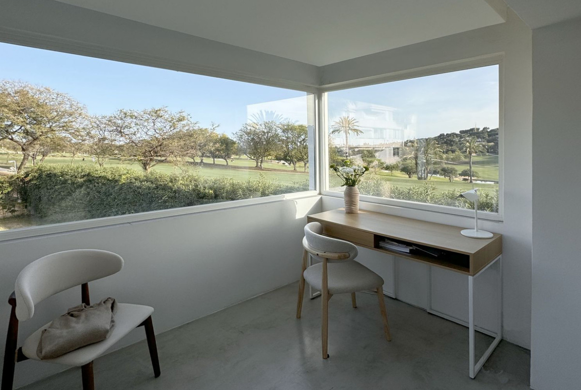The property is set within a quiet, gated community of only 10 units, making it an ideal permanent residence or investment. The house offers three bedrooms, all located on the upper floor. The master bedroom features an en-suite bathroom and a dedicated office area with beautiful views over the golf course.