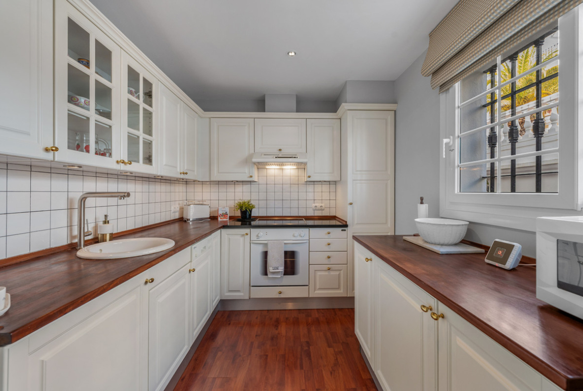 Step through the charming cobblestone street entrance onto the main living floor, where a warm, characterful home immediately welcomes you. To the right, a separate kitchen impresses with its wooden countertops and a traditional feel that perfectly complements the Andalusian surroundings. The open living and dining area flows naturally towards a covered terrace, ideal for al fresco dining, with lovely views over the golf valley and the mountains beyond. An enclosed woodburner and modern air conditioning and heating throughout ensure the home is a tranquil and comfortable retreat in every season.