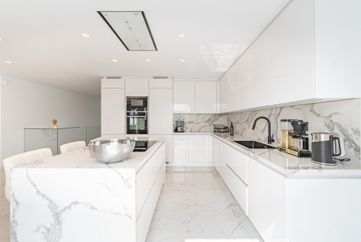 Spanning 158m² over three floors, the townhouse blends modern design with abundant natural light. The entrance level features an elegant, open-plan kitchen with a glossy breakfast island (seating for three) and floor-to-ceiling windows that flood the space with sunshine. Adjacent to the kitchen, the sun-filled living/dining area flows seamlessly outdoors, with sliding doors amplifying the bright, airy feel. A guest bedroom with an en-suite bathroom, also on this level, benefits from the same warm, natural light. The primary and second bedrooms downstairs include en-suite bathrooms designed with clean lines and contemporary finishes. The crowning feature is the 100m² roof terrace with uninterrupted sunset views over the Golf Valley. Designed for indoor-outdoor living, the terrace’s minimalist layout and sun-drenched surfaces make it ideal for relaxing or entertaining. Every level prioritises light and modern simplicity, creating a bright, inviting home.