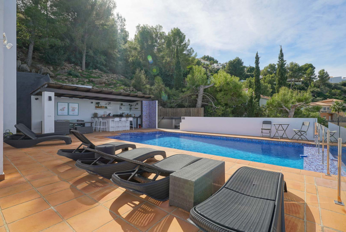 The outdoor area has been designed to make the most of the Mediterranean climate: a private swimming pool surrounded by covered and uncovered terraces, a barbecue with a summer kitchen, a jacuzzi, a storage room, and a garage complete the amenities of this magnificent villa. It also features hot/cold air conditioning, a laundry room, and a parking area.