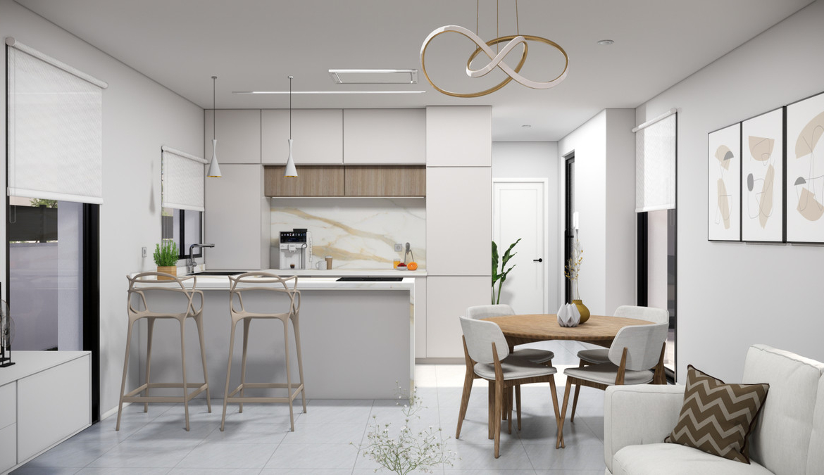 Enjoy the freedom to choose from a selection of floor and bathroom tiles, allowing you to personalize your interior finishes. The kitchen carpentry is crafted with quality materials and modern design, combining functionality with aesthetic appeal.