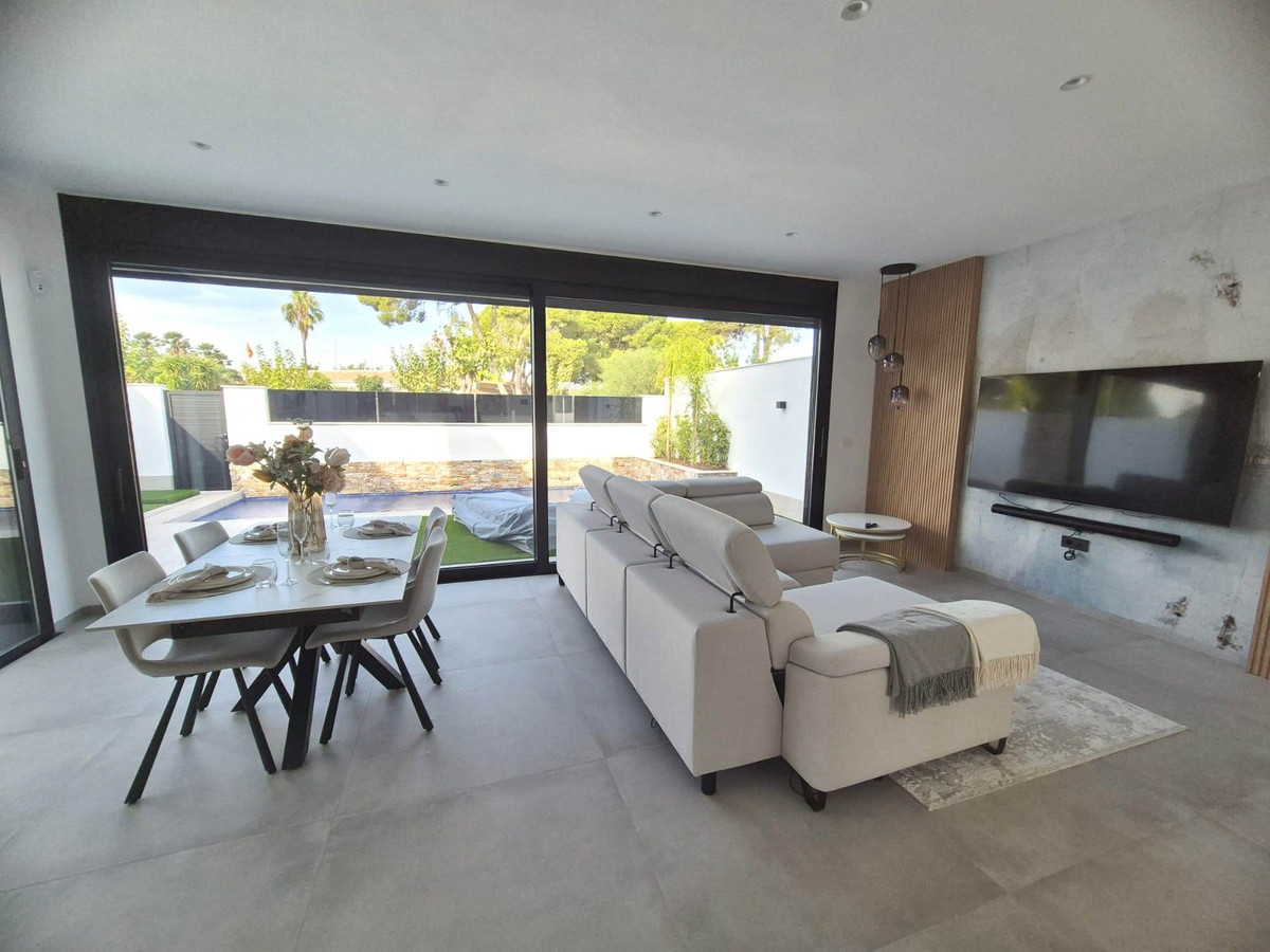 This West Facing, Three Bedroom, Semi Detached Villa in Santiago de la Ribera, is located just 750 metres from the beautiful 4km stretch of beach, lined with a fantastic variety of café bars and restaurants. Originally a charming fishing village, this area now offers a wonderful blend of tradition and modern coastal living. Main chain supermarket is conveniently close by, while San Javier town and the popular Dos Mares shopping centre are only a 5–10 minute drive away. Excellent road connections via the AP-7 and N-332 make travelling along the Costa Blanca South effortless. Built in 2025, this exquisite 143m² villa offers outstanding contemporary design and comfort. The open plan living space is bright and spacious, featuring wall-to-wall glazed doors that open directly onto the garden and pool area, creating a seamless indoor–outdoor flow. A glazed door from the dining area leads to a lovely private patio. The fitted modern kitchen with central island provides an elegant and functional cooking space. On the ground floor, you will also find a cloakroom and a double bedroom with an en-suite shower room and access to a front garden terrace. The first floor comprises two additional double bedrooms, each with walk-in wardrobes and access to a spacious terrace. The master bedroom benefits from its own stylish en-suite shower room. Both shower rooms throughout the villa are beautifully designed with double sinks, walk-in showers and underfloor heating for added luxury. From the first-floor terrace, steps lead up to the impressive 48m² private solarium, partially laid with artificial grass. This fantastic space is perfect for relaxing or entertaining, complete with an outdoor kitchen area that can be enclosed, integrated outdoor speakers, and views over the municipal garden. The property includes Airzone air conditioning, mosquito blinds, two automatic awnings, and a front tiled garden with access to the garage. This is a truly exceptional modern home in a prime coastal location on the Costa Blanca South.