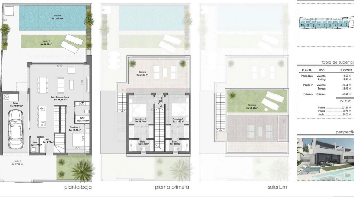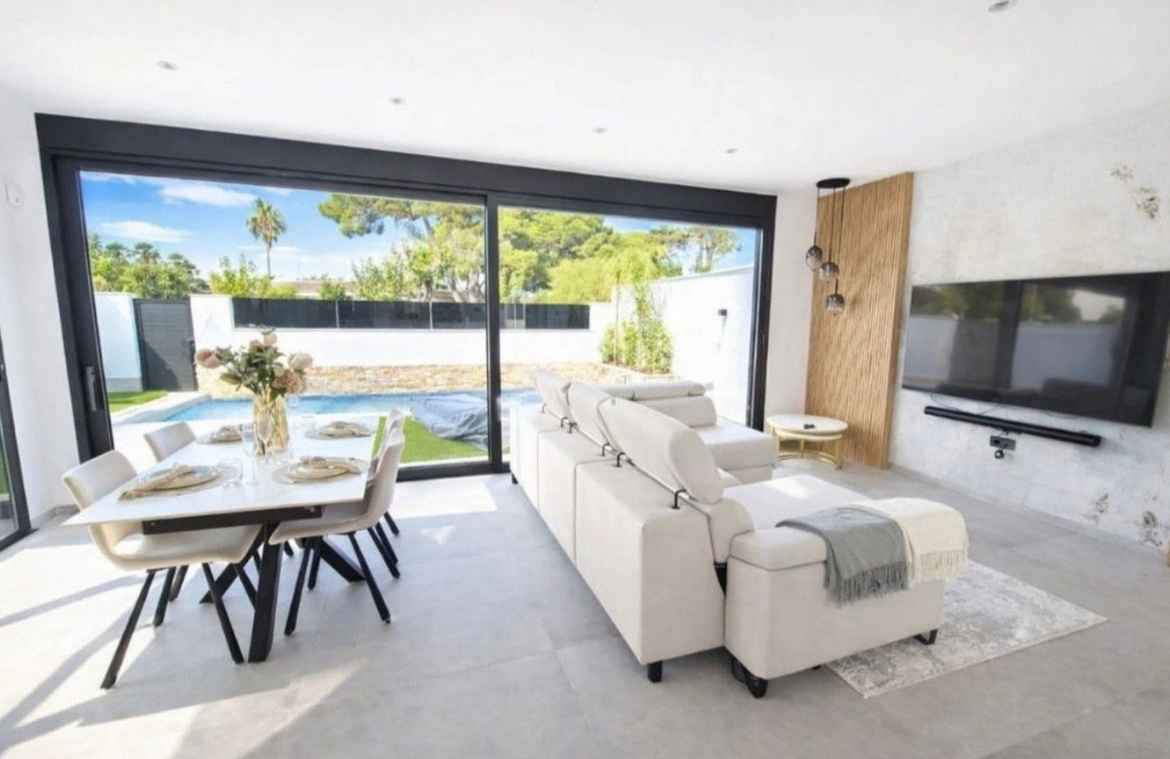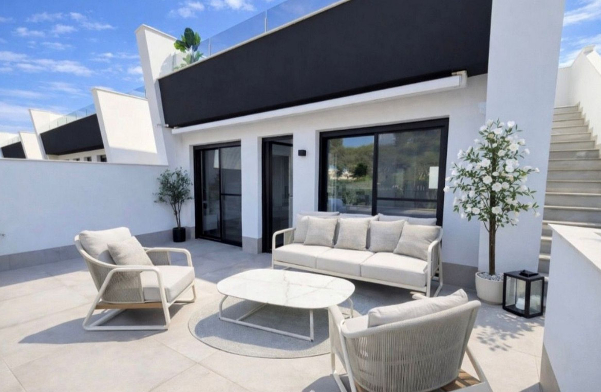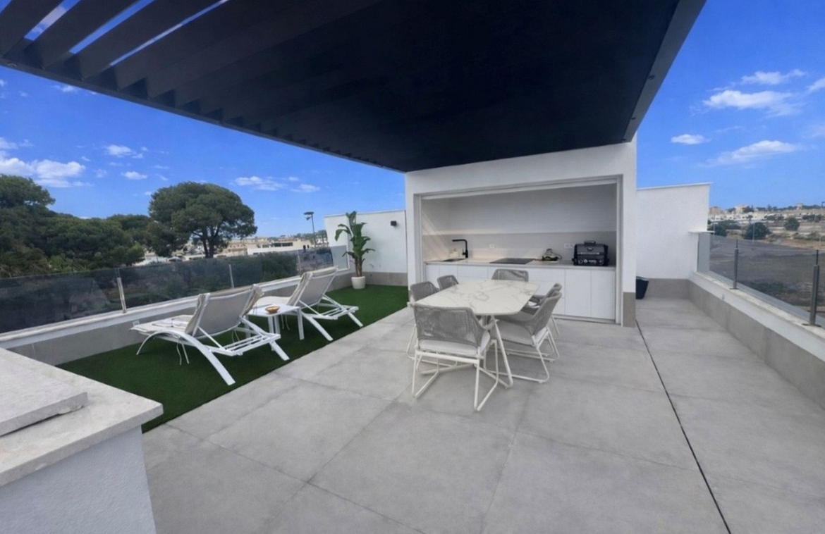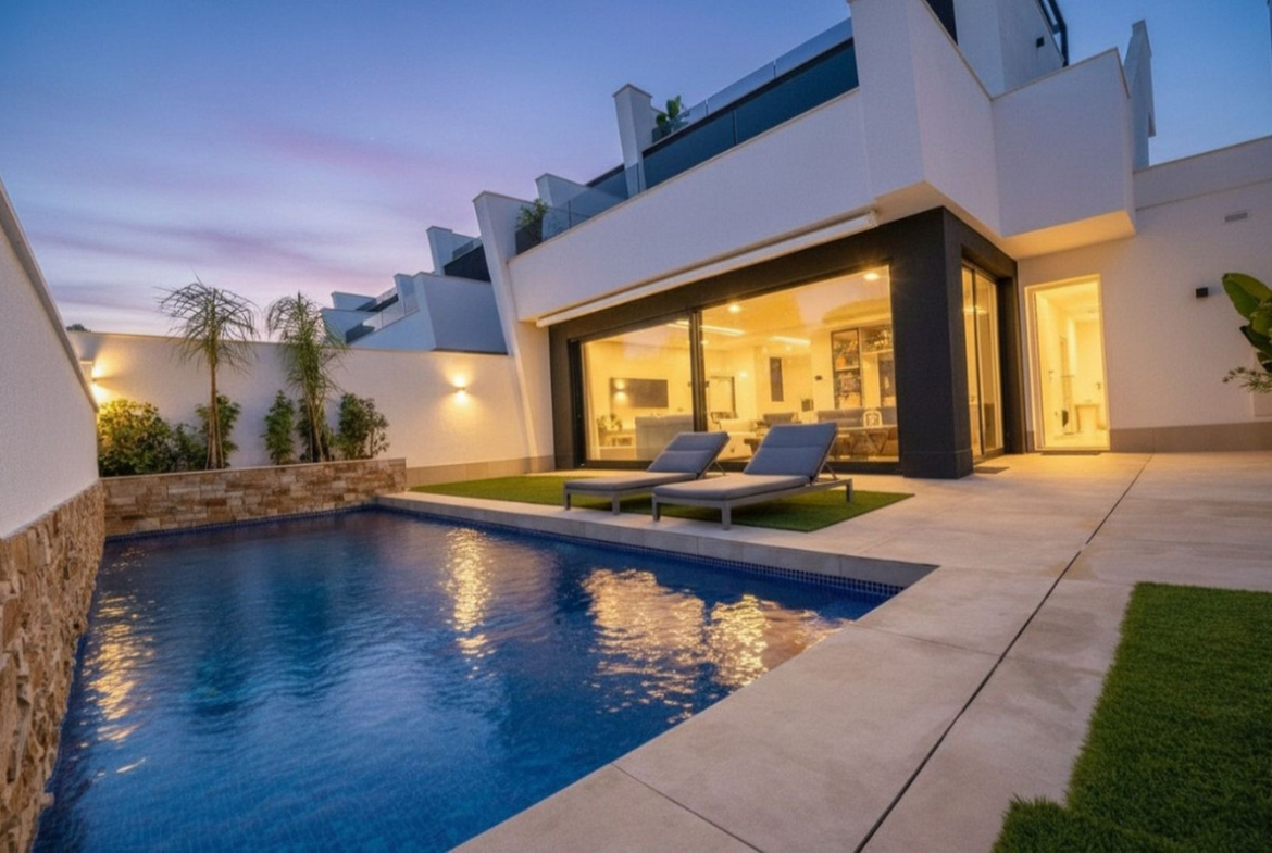 We are proud to present this Stunning New Build Resale Villa located only 900m to the beaches, Ribera Nature Villas is located in Santiago de la Ribera and consists of 3 bedrooms with 2 offering private terraces, 3 bathrooms, living/dining area and a fully fitted kitchen. The villa benefits from air conditioning throughout, private terraced areas to the front and rear of the property, private heated swimming pool and a large roof solarium with outside summer kitchen and an integrated garage. The property is sold furnished with anti solar glare glazing, automated mosquito blinds, and electric awnings.