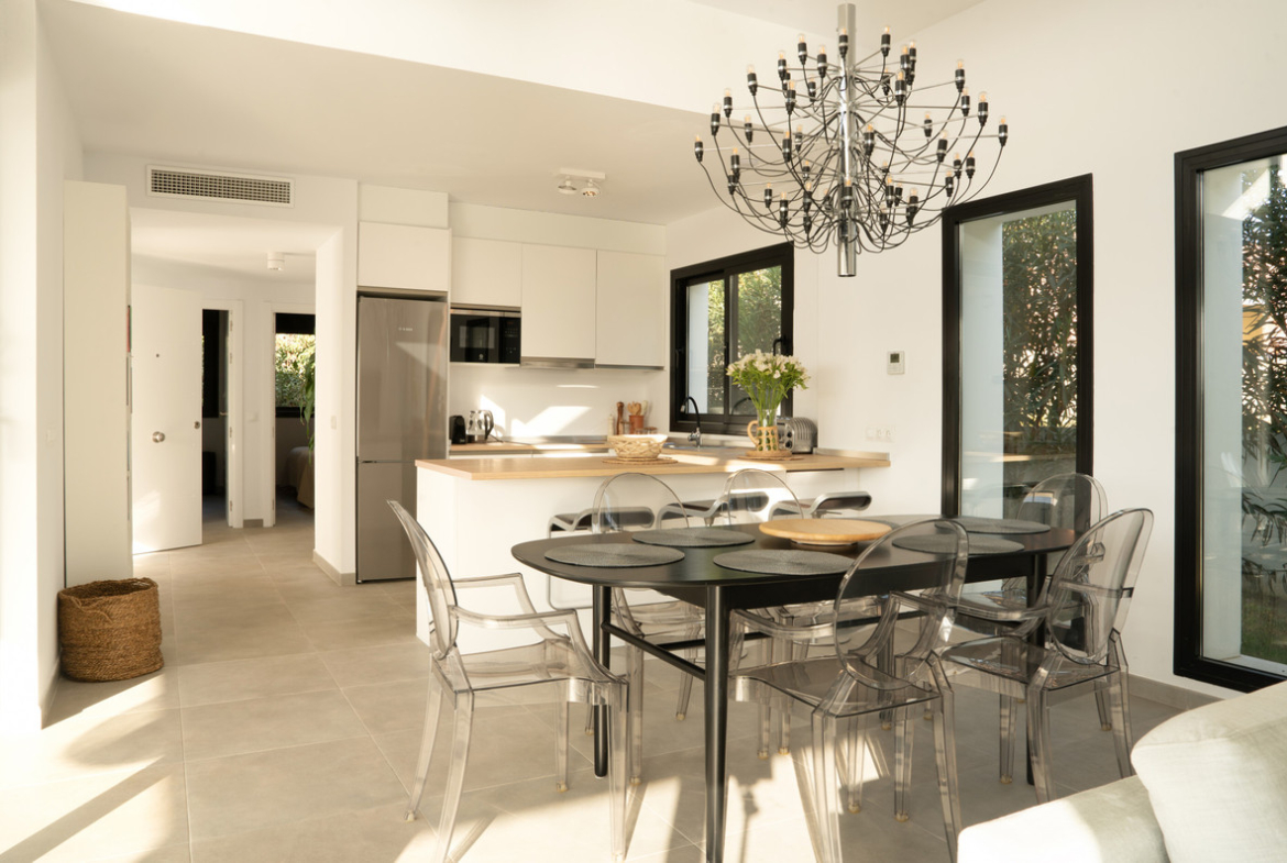Outside, a private pool and landscaped garden create a relaxed atmosphere, with flowering plants that bring colour throughout the year and give the property a pleasant, spring-like feel. Several terraces provide ideal areas for dining or spending time outdoors.