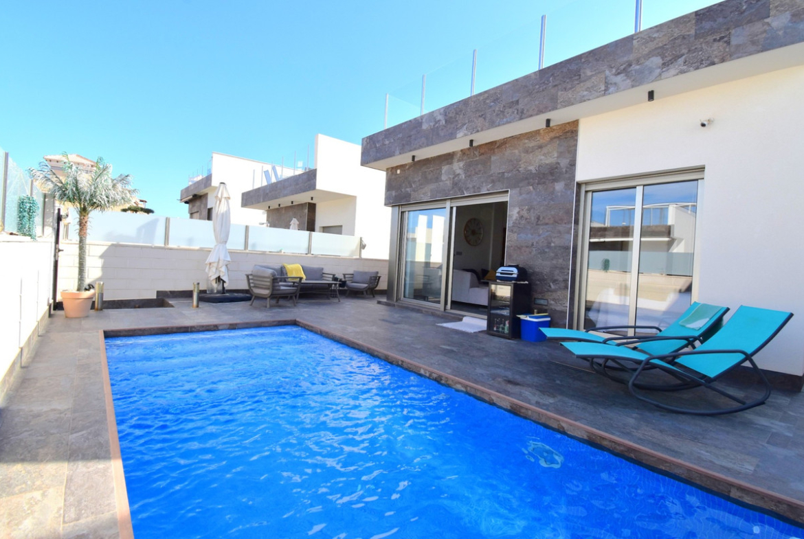 This Stunning South-East Facing, Three Bedroom Detached Villa in Villamartin is located in the desirable area of Orihuela Costa, Costa Blanca South. Within a 10-minute walk to the closest shops and just a short drive to the popular La Zenia Boulevard commercial center, this villa offers both convenience and comfort. The stunning beaches of the area are only a 10-minute drive away, providing the ideal setting for a relaxed Mediterranean lifestyle. The villa features three spacious bedrooms, each with air conditioning and fitted wardrobes, ensuring comfort throughout the year. The main bedroom also includes a ceiling fan for added comfort. The open-plan fully fitted kitchen is modern and practical, and it seamlessly connects to the living room, which is equipped with air conditioning. Additionally, a separate utility room adds to the functionality of the space. The outdoor area is just as impressive, with a low-maintenance tiled garden surrounding a private swimming pool. The outdoor sitting area overlooks the pool, offering the perfect space for enjoying the warm Mediterranean weather. With a 200m² plot, this villa offers ample space for relaxing and entertaining. Located in a prime position, this villa provides an exceptional opportunity for year-round living or a perfect holiday retreat in Orihuela Costa.