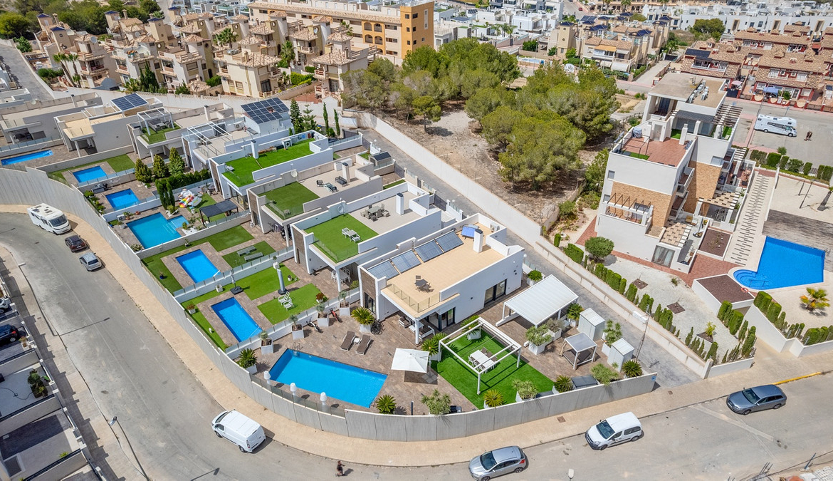 This modern detached villa, built in 2018, is located in Villamartín, Orihuela Costa. With a built area of 113 m² on a generous 464 m² plot, the property offers a contemporary design and a functional layout perfect for enjoying the Mediterranean lifestyle. Its south-facing orientation ensures natural light throughout the day, creating a warm and inviting atmosphere.