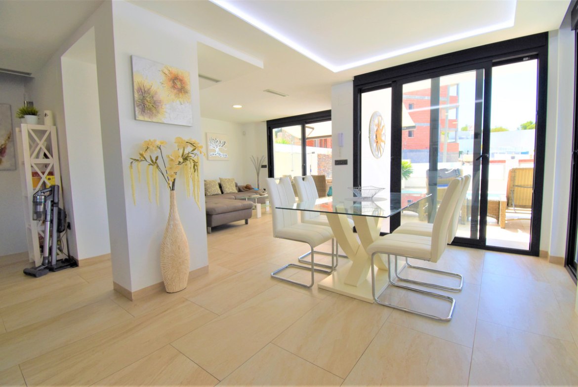 This West Facing, 2018 Built, Three Bedroom, Detached Villa in Las Filipinas, a popular residential area within Villamartin. A variety of bars/restaurants can be found just ten minutes on foot; the nearest main chain supermarket, five minutes by car along with three golf courses, Villamartin Plaza, La Fuente commercial centre. La Zenia Boulevard shopping centre is ten minutes by car and the beaches along the coast fifteen minutes. Having been built by a reputable constructor, the qualities within this property are second to non. The main living area being open plan with two sets of wide sliding doors, one from the lounge and the other the dining area which lead out to the pool area, there are also stairs leading up to the first floor and to the underbuild. The kitchen is fully fitted and there is a shower room plus a double bedroom with en suite shower room along with a terrace. On the first floor there is a further double bedroom with dressing room, en suite and access up to the solarium. The underbuild comprises of a lounge and kitchen area plus a double bedroom with en suite, double sliding doors to the outside and a kitchen area. The garden is tiled with an artificial grassed area, a 7×4 private pool and off road parking Extras include air conditioning, electric gates and built in wardrobes in bedrooms.<br /