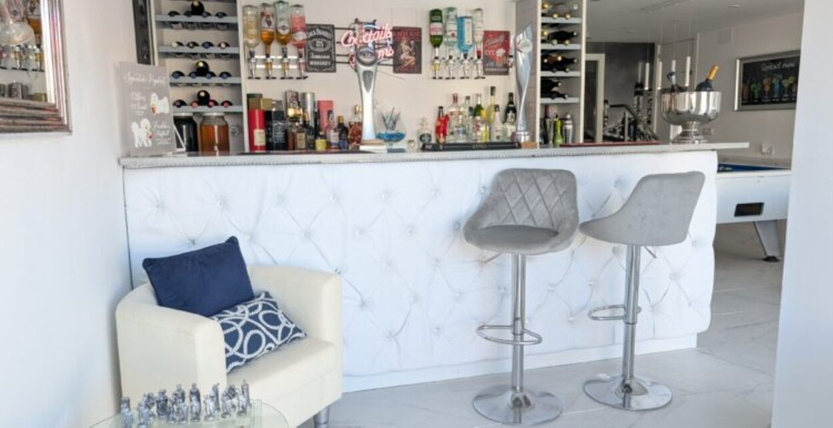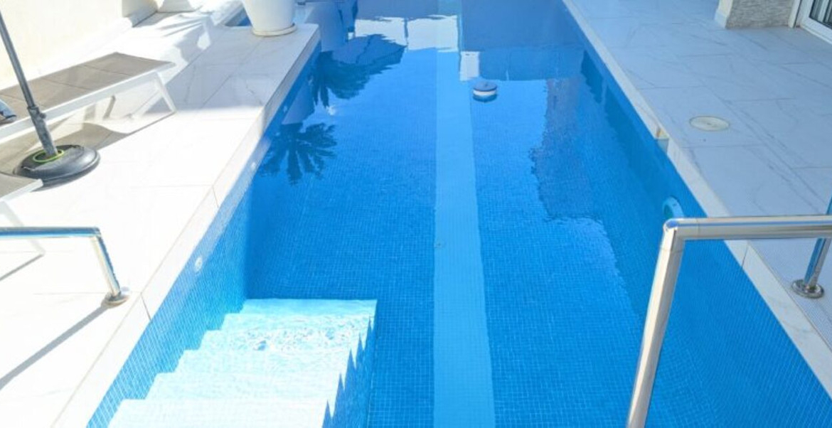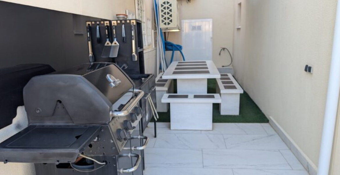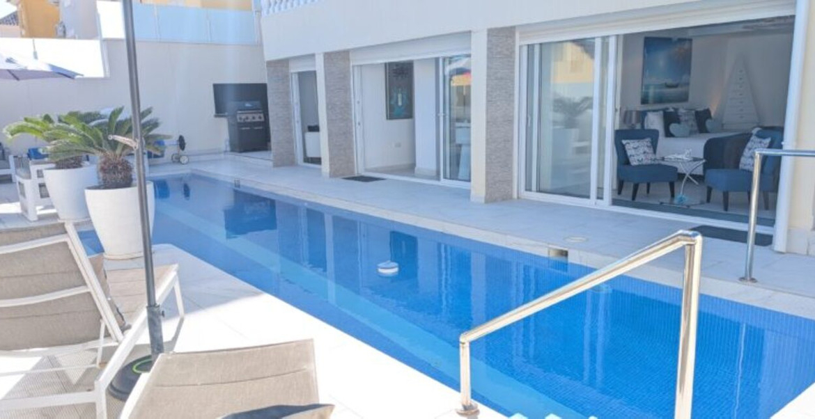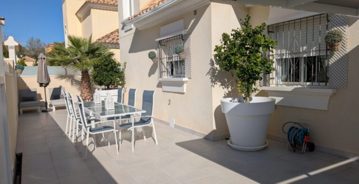 This stunning 3-bedroom villa in Villamartin offers luxury and tranquillity. It is located within a gated and secure complex. Situated in the centre of an elevated plot of 300 m² in the neighbourhood of Las Filipinas, overlooking the villas opposite and towards a wooded horizon to the Mediterranean Sea.OUTDOORLIVING The garden has a pedestrian entrance gate as well as an electric vehicle gate leading out to a carport covered by a floating pergola.A 2.4-meter-high wall topped with frosted glass panels offers ample privacy. The plot itself is a tiled area that requires no maintenance and at the front of the villa there is space to eat or play table tennis.There is also a sunny corner for sun loungers with a mature palm tree offering shade. An orange and lemon tree in two huge white ceramic pots give a true Mediterranean atmosphere upon arrival.A covered porch protects access to the front door, while to your left is a storage cupboard.Next to this, a staircase descends to the stunning swimming pool. Fourteen meters long, with a jacuzzi area and a variety of multi coloured LED lights for wonderful night effects.The pool is saltwater, with a state-of-the-art heating system for year-round swimming, an LED-lit waterfall, and a balloon at the far end.The surrounding tiled garden has space for sofas, sun loungers and parasols, as well as statues and a variety of large potted plants. Again, a wall with tall frosted glass panels provides complete privacy.This is the perfect area for a quiet swim or to party the night away to the rhythm of the twinkling lights.At the far end of the pool and to the right is a barbecue area next to a covered seating area with a table and stone benches.To the rear is a large room which stores the pool heater, pool pumps and jacuzzi and over 6 m² of additional tiles matching those used inside and outside the property in case of future breakage. LIVING SPACEThe Semi-Basement:Three sets of French sliding doors lead to adjoining areas of this air-conditioned “fun” part of the villa. To the left is a bar with leather cushions, along with table and chairs, bar stools, wine racks, a beer tap and a wine fridge.To the right is a large rectangular space where the owners currently have a full size pool table, foosball, electronic dartboard and a sofa.At the rear left there is a completely soundproofed cinema room. Buyers will have to provide their own TV and Dolby Atmos sound system, but the pull-out sofa, curtain and director's clapperboard remain.To the rear there is a bathroom and another storage room and to the right is a large bedroom with hot/cold air conditioning.Ground floor:The front door opens into a small hallway with access to the left leading to a full bathroom with sink, vanity unit and “waterfall” walk-in shower.Straight ahead is a large open plan lounge, dining room and kitchen. The kitchen is fully equipped with integrated appliances including microwave, two ovens, fridge-freezer, dishwasher, ceramic hob and extractor hood. A black breakfast bar with granite worktop separates the kitchen from a bright and spacious L-shaped lounge.This has hot/cold air conditioning, oil-filled electric wall radiators and three sets of French doors to the outside terrace. To the rear, the lounge leads to an air-conditioned dining room.French doors from the lounge lead out to a long terrace that runs the entire length of the rear of the property overlooking the pool.The Location: Villamartin is a very popular holiday resort for especially for golfers. There are three excellent golf courses that are close to each other in the Villamartin area although Villa Martin Golf Course is by far the most established and best known of the three (the other two are Las Ramblas and Campoamor). Villa Martin is a fine championship course and is noted for hosting the 1994 Mediterranean Open. The golf course provides some stunning scenery and is of medium difficulty with excellent quality greens. The Campoamor and Las Ramblas golf courses are close by and are just a few minutes’ drive away.The renowned Villa Martin Plaza has a great selection of bars, shops and restaurants and is the ideal spot for that “special night out”. This beautiful central square has a bank, supermarket, shops, cafes and some excellent restaurants. The gardens are very picturesque, look closely and you will notice the naked lady golfer statue. Close to Villamartin are numerous un-crowded beaches with magnificent views over the sparkling blue Mediterranean and the “white sand” that are typical of the Costa Blanca. The beaches along the coastline close to Villamartin are Playa Flamenca, La Zenia, Cabo Roig, and Campoamor. All of these beaches and all the other major beaches along this part of the Mediterranean coastline are regularly awarded the European Blue Flag which is your guarantee of high standards and facilities for the whole family. Villa Martin is situated about 8 kilometres south of the bustling town of Torrevieja on the southern Costa Blanca and is just a short drive from the motorway (AP-7).