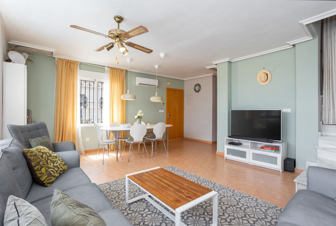 Well-planned and homely townhouse with an attractive location A warm welcome to this well-planned and homely townhouse with an attractive location in Villamartin. This villa has an inviting feel and lightly furnished spaces, there are three bedrooms, two bathrooms, living room and kitchen.