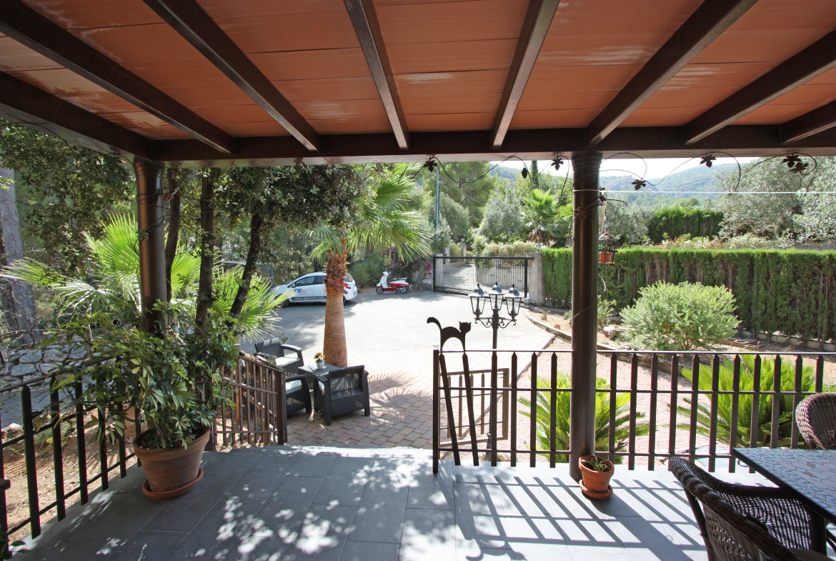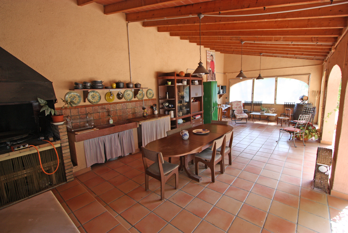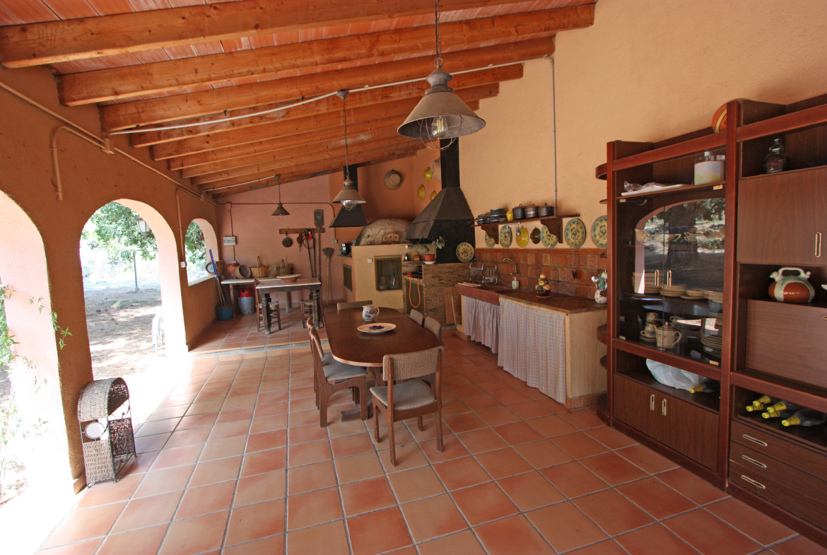 Beautiful idyllic house for sale, this property is made from a solid wooden construction and situated on the outskirts of Orba and situated on large plot with very old trees, large outdoor kitchen, stables, a great pool and pool area and fabulous views of the mountains. The plot is almost completely flat therefore ideally suited for keeping horses, there is a large parking and large garage which can still be converted to add more living space. The house was built by a specialized company that deals with wooden buildings. The total plot is around 17,000 m² and the total constructed area is around 380 m² and the pool is 4 × 9 m. The main living area is distributed of entrance area, a spacious living room with a view of the garden and the mountains, a very large dining kitchen with adjoining pantry and three bedrooms and two bathrooms. The internal staircase leads to the spacious loft area, which is ideal as a chill out area or additional bedroom. In front of the main entrance there is a beautiful covered terrace and the living room has access to the garden and pool area. The basement and the garage are made of solid construction and can be converted in to living space and there is already a toilet. Approximately 50 m away there is a fabulous spacious outdoor kitchen area, with its own oven and plenty of seating area. There are also many old pine trees and the stables which reinforces the rustic impression of the property. This is a unique property and has to be viewed to see its potential. Orba is approximately 15 km from the sea and has itself an excellent infrastructure with a large supermarket, bakery, butcher, veterinarian, optician, as well as over 15 bars and restaurants.