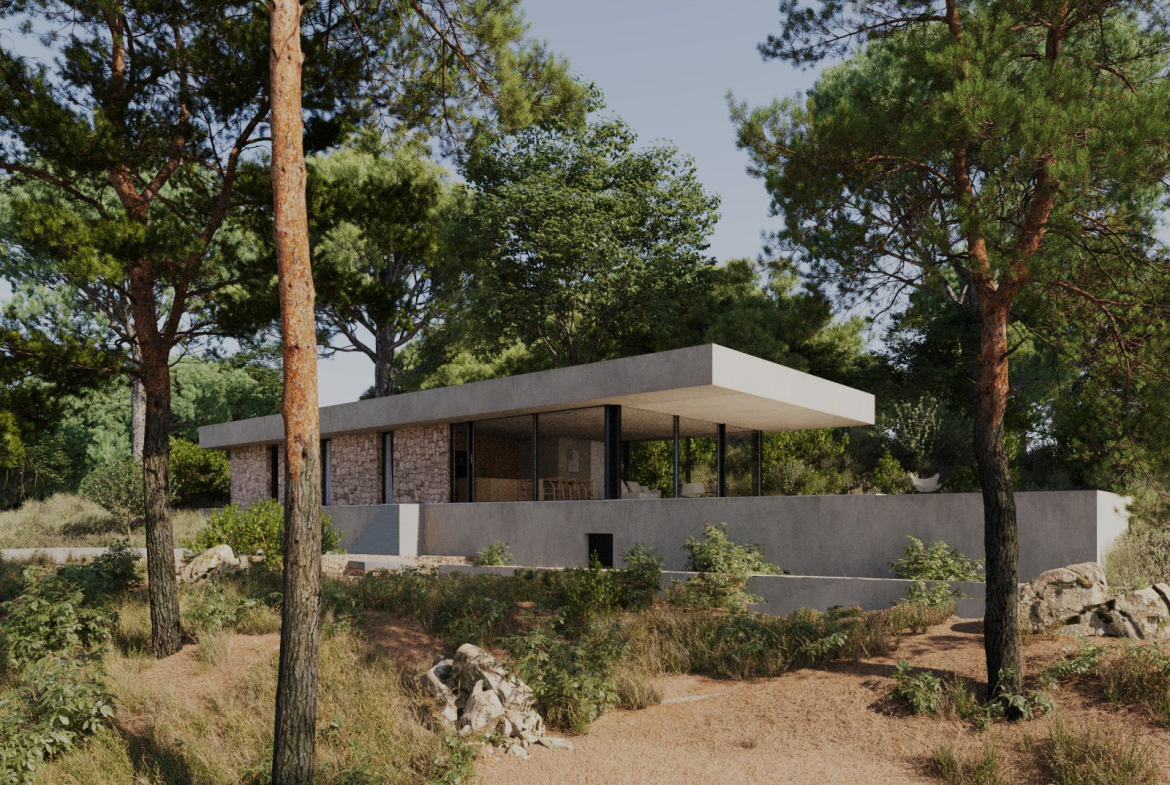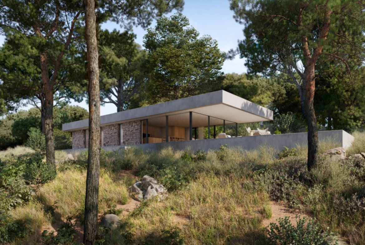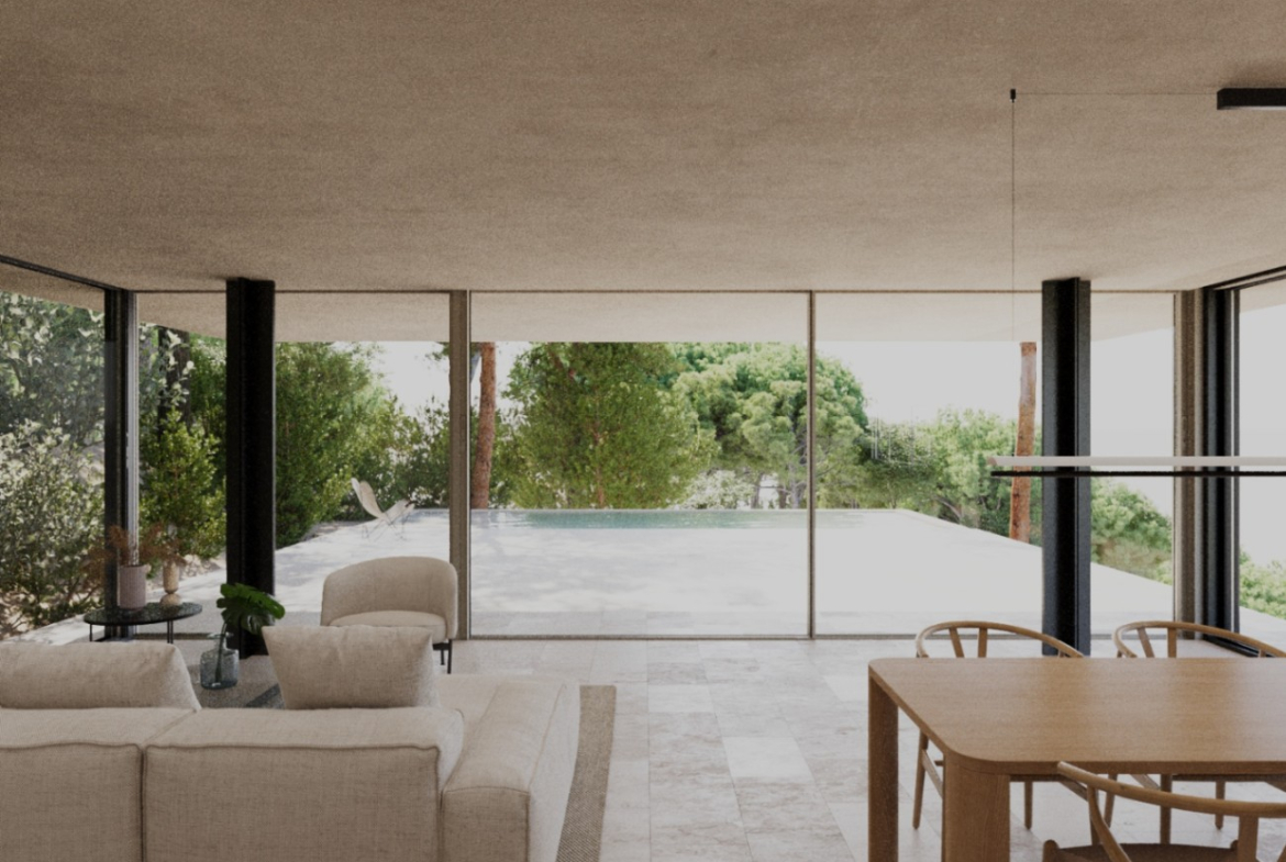 House under construction in modern minimalist style of 253 sq meters distributed in 227 sq meters of living space on ground floor including porch and 26 sq meters of basement. It is situated on a plot of 800 sq meters with good views located in a natural area surrounded by big trees. The house will be built in a style that integrates with the landscape, with imitation concrete walls and natural stone decorations in a way that combines ultramodern elements with a traditional rustic touch as shown in the 3 D images. The main floor is distributed in a spacious glazed living-dining room with open plan kitchen, hallway, 3 bedrooms, 2 bathrooms, one of them en suite in the master bedroom, service toilet and a wide covered porch in the form of a cantilever without pillars which leads to the pool terrace. Air conditioning hot and cold is included throughout the house. The price includes a swimming pool 9,45 x 3,30 meters as shown in the plans. The access to the house will be with concrete and a parking for several cars is also included in the price, as well as the metal fencing of the plot. The kitchen units and electrical appliances will be chosen and paid for by the client. For further information please contact our sales team.