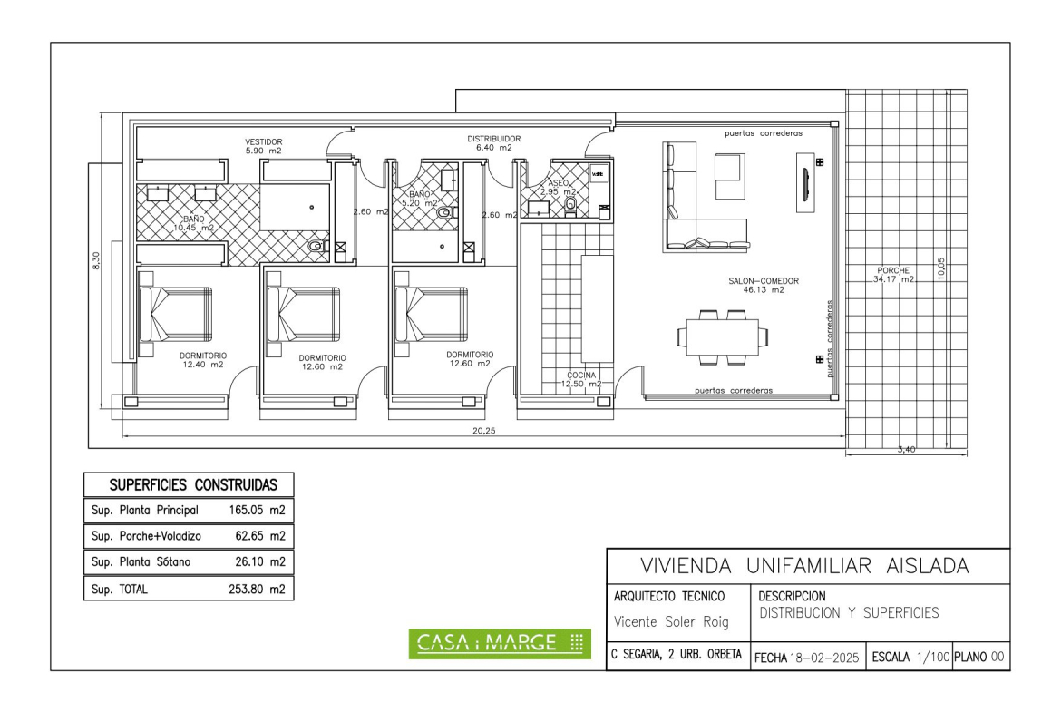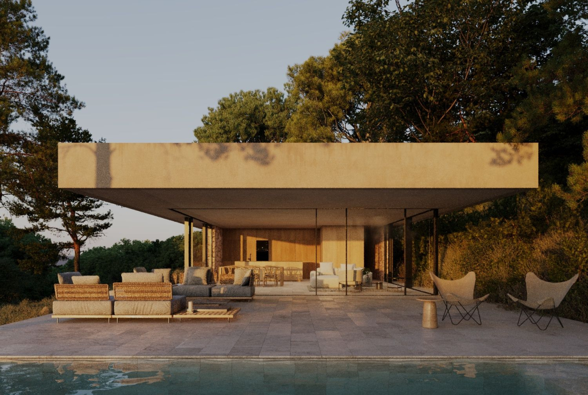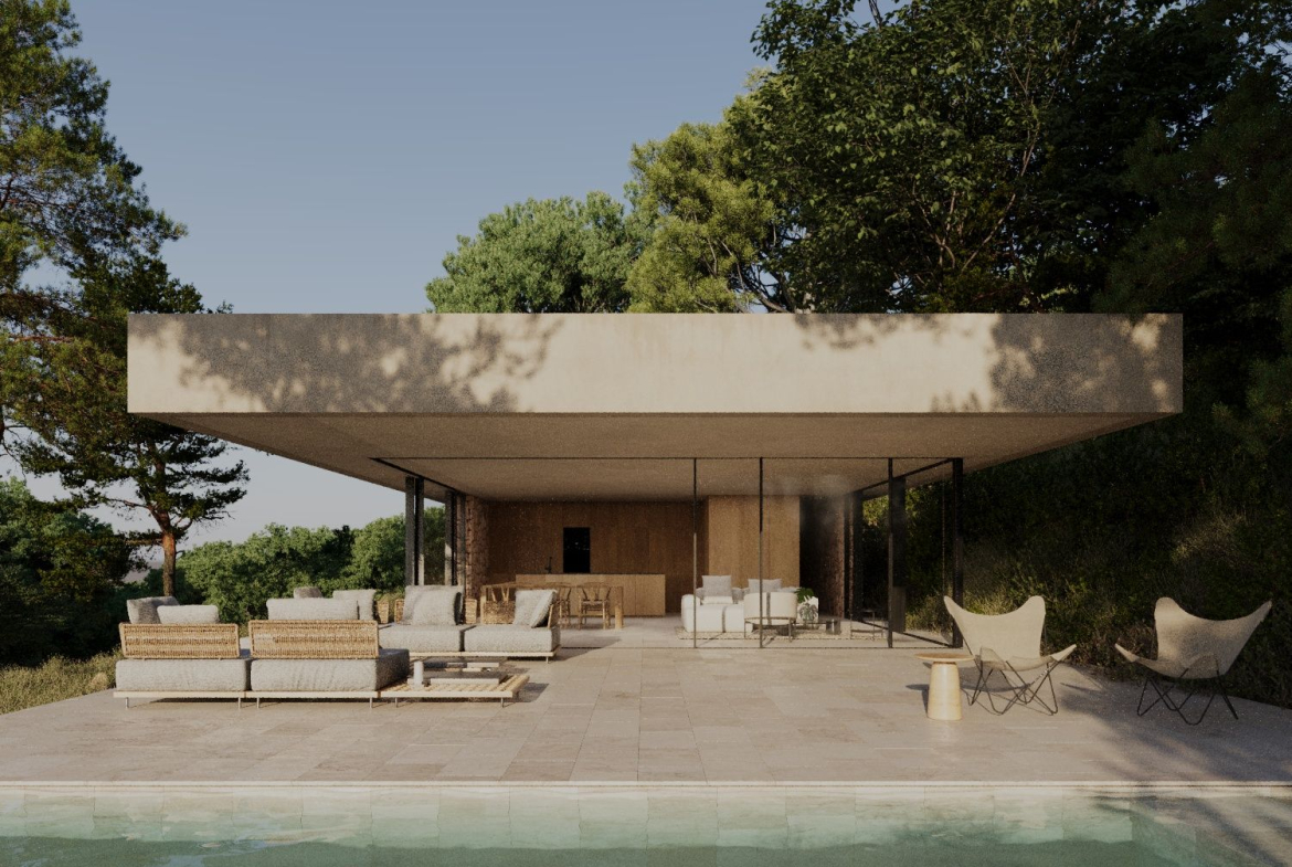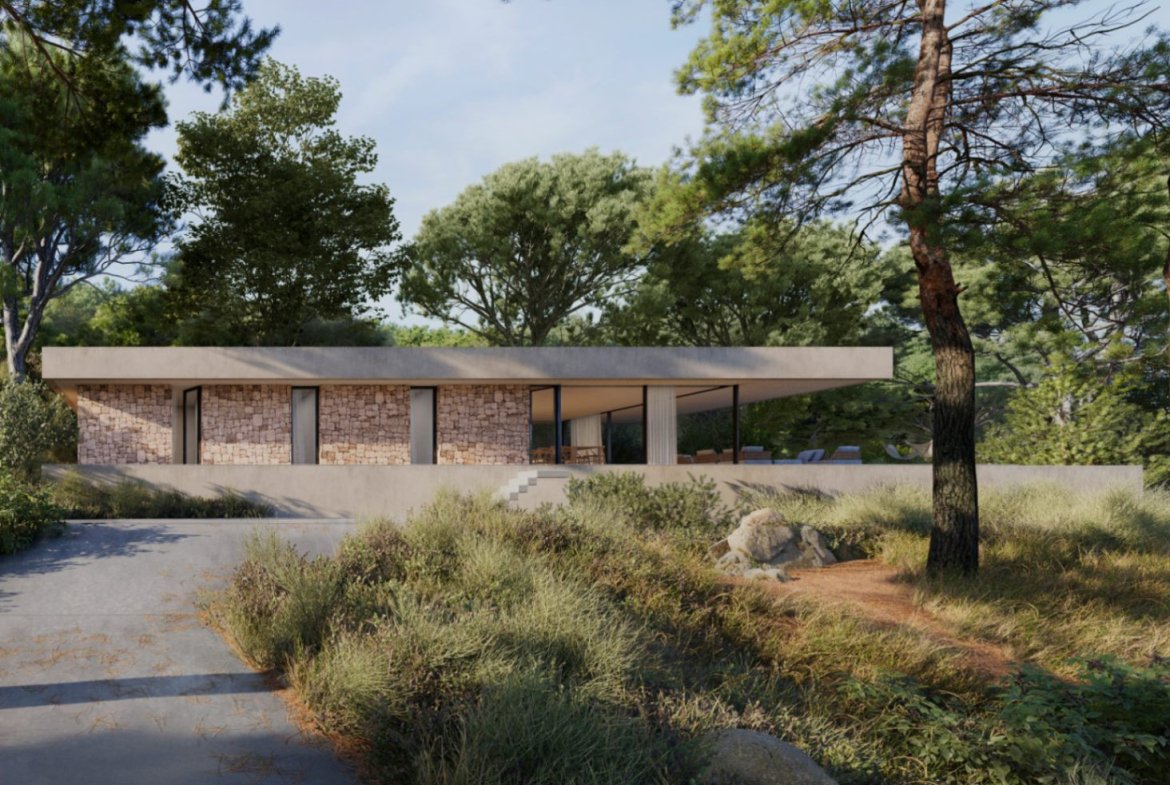 House under construction in modern minimalist style of 253 sq meters distributed in 227 sq meters of living space on ground floor including porch and 26 sq meters of basement. It is situated on a plot of 800 sq meters with good views located in a natural area surrounded by big trees. The house will be built in a style that integrates with the landscape, with imitation concrete walls and natural stone decorations in a way that combines ultramodern elements with a traditional rustic touch as shown in the 3 D images. The main floor is distributed in a spacious glazed living-dining room with open plan kitchen, hallway, 3 bedrooms, 2 bathrooms, one of them en suite in the master bedroom, service toilet and a wide covered porch in the form of a cantilever without pillars which leads to the pool terrace. Air conditioning hot and cold is included throughout the house. The price includes a swimming pool 9,45 x 3,30 meters as shown in the plans. The access to the house will be with concrete and a parking for several cars is also included in the price, as well as the metal fencing of the plot. The kitchen units and electrical appliances will be chosen and paid for by the client. For further information please contact our sales team.