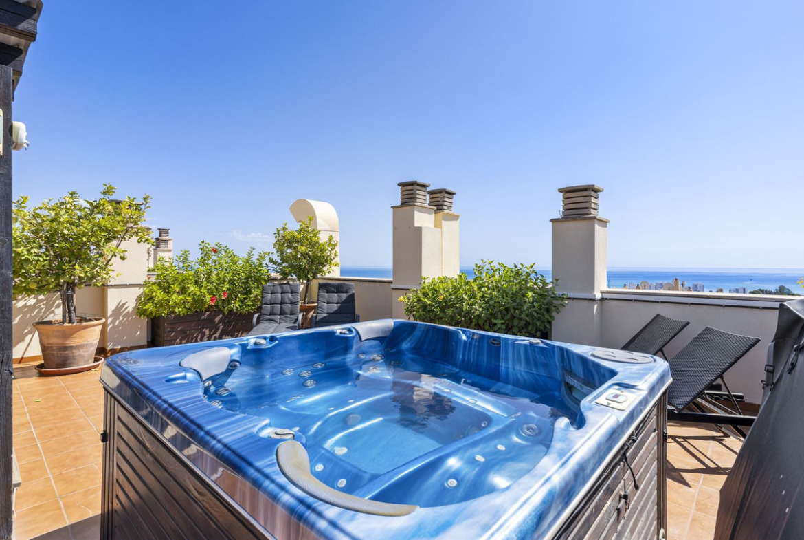 An extraordinary 120 m² rooftop solarium featuring a private spa/jacuzzi and an elevated covered terrace lounge, with sea and mountain views.