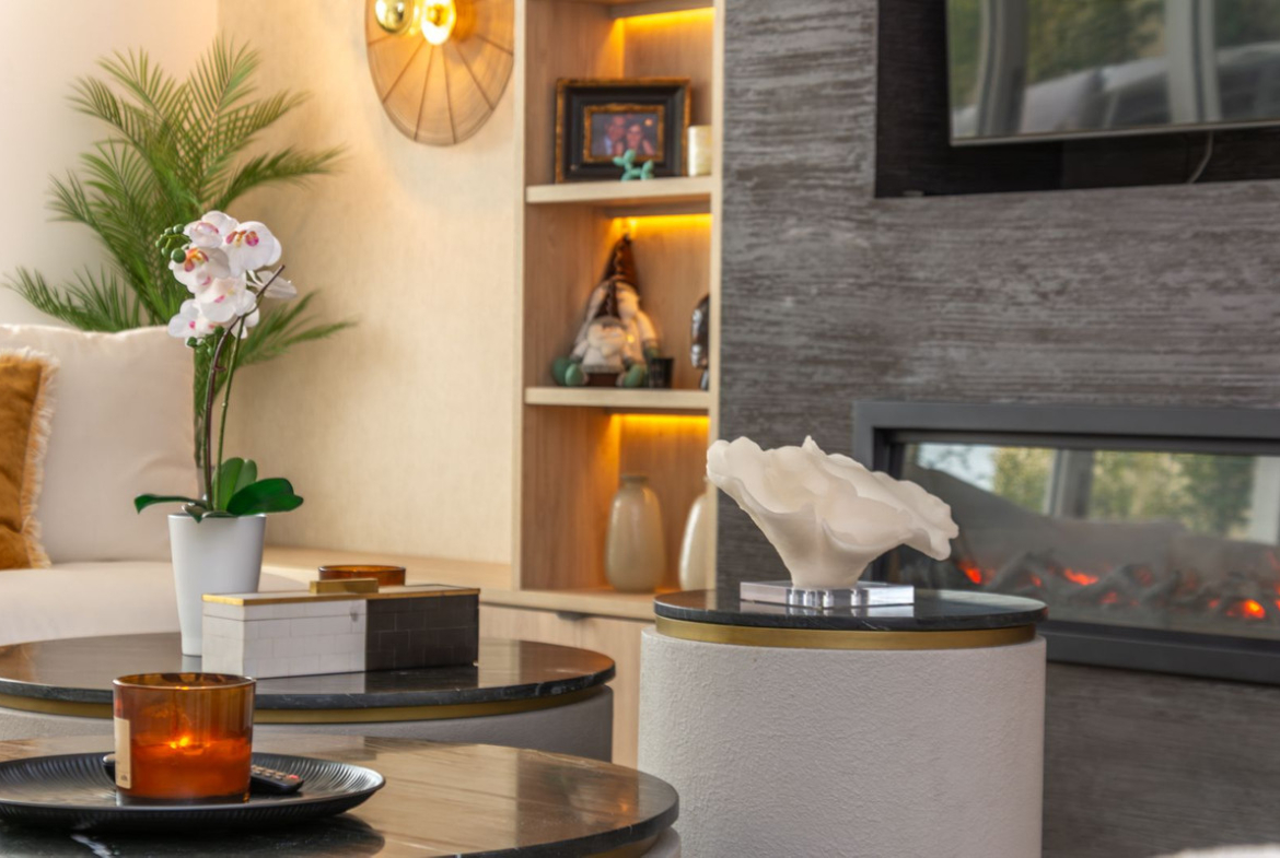 Living Room: Expansive and light-filled with floor-to-ceiling glass doors opening onto the terrace. Generous lounge and dining areas designed for refined entertaining and relaxed living. Place built furniture and gas fireplace.