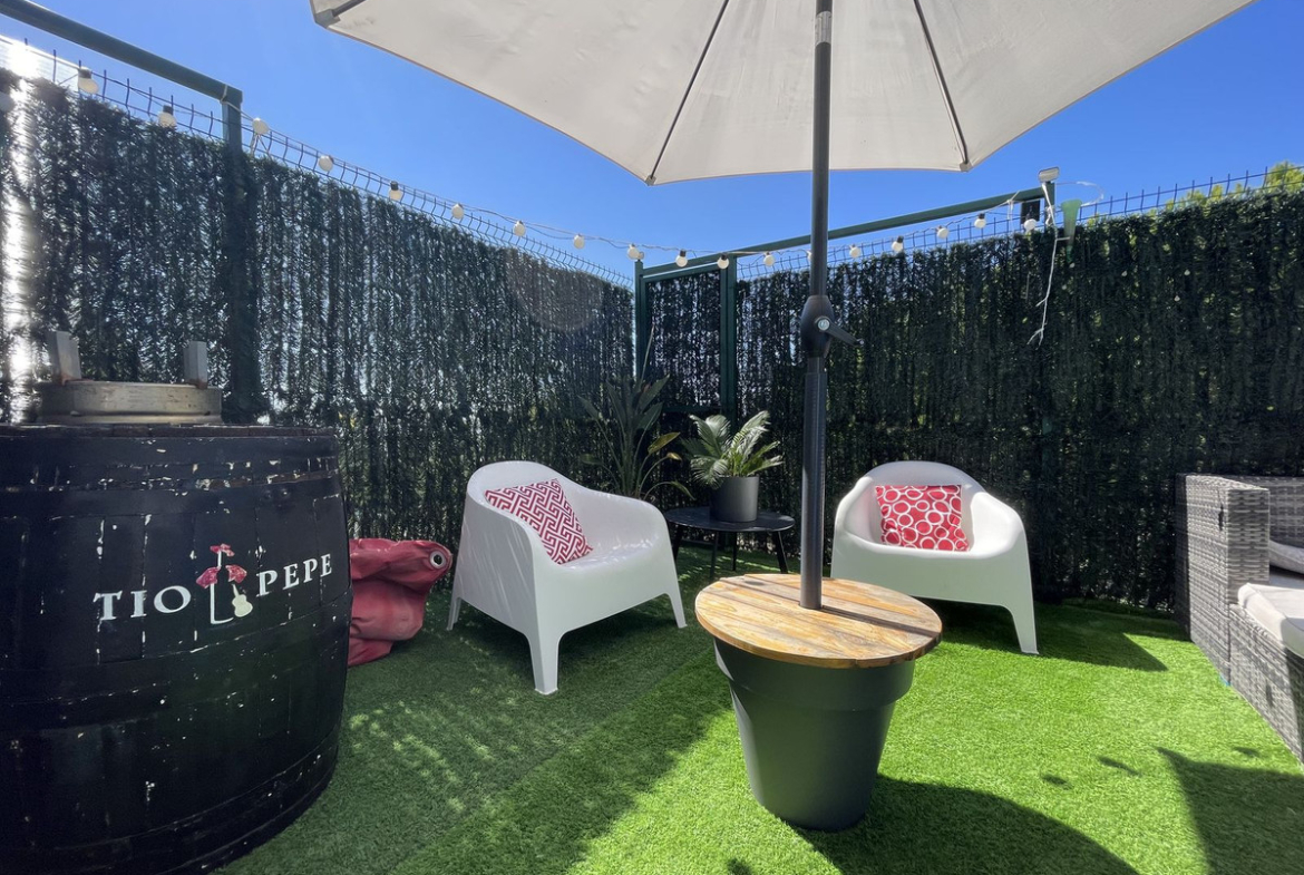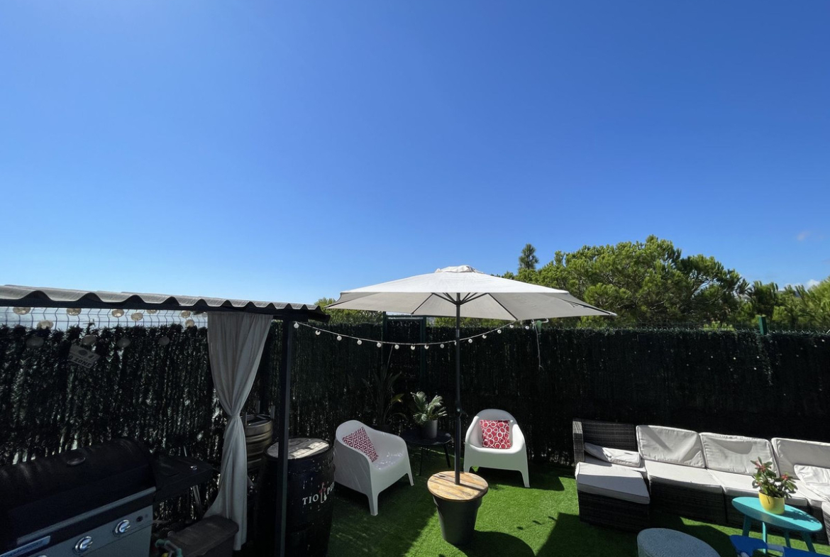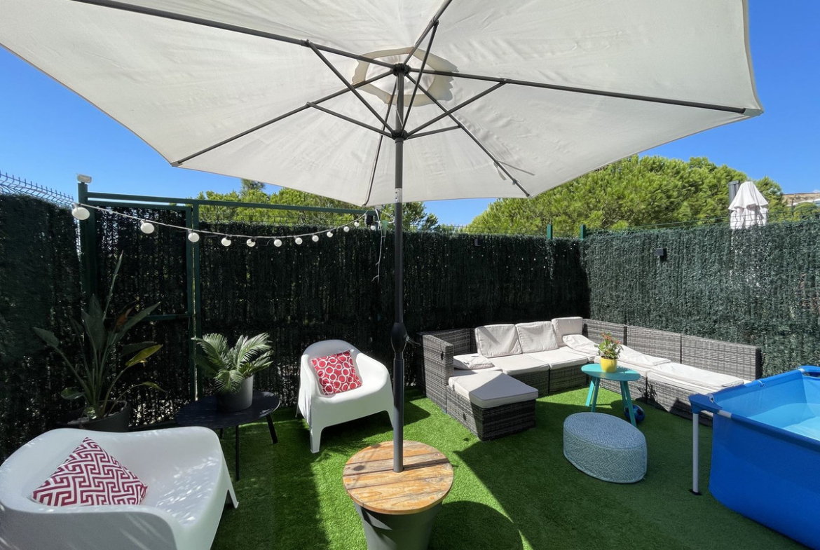 Fully renovated front patio of more than 30 m², finished with concrete flooring and low-maintenance artificial grass. A pergola with integrated gas barbecue makes it the ideal setting for gatherings with friends and family.