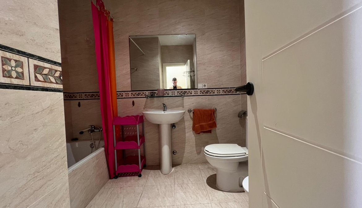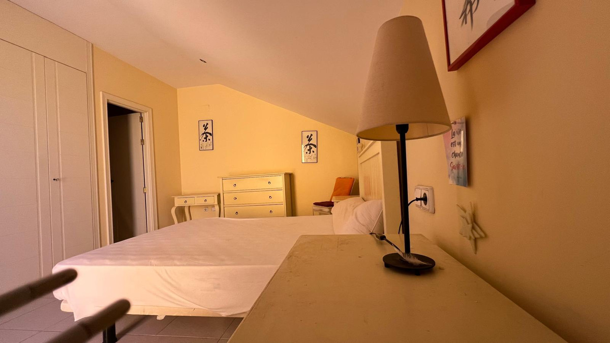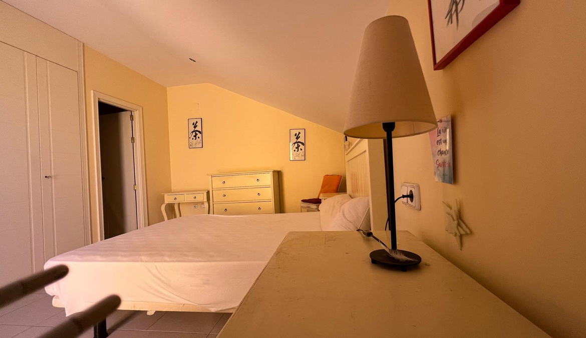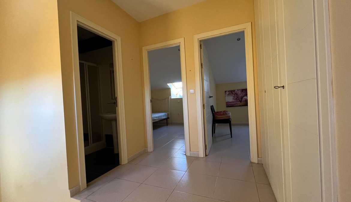 The upper floor houses three bedrooms with built-in wardrobes and two full bathrooms. From here, there is access to a large private solarium, perfect as a relaxation or chill-out area. It includes split air conditioning, appliances, a storage room, and a numbered parking space.