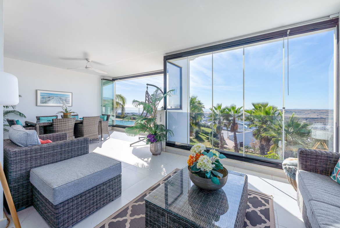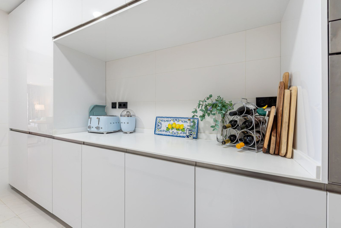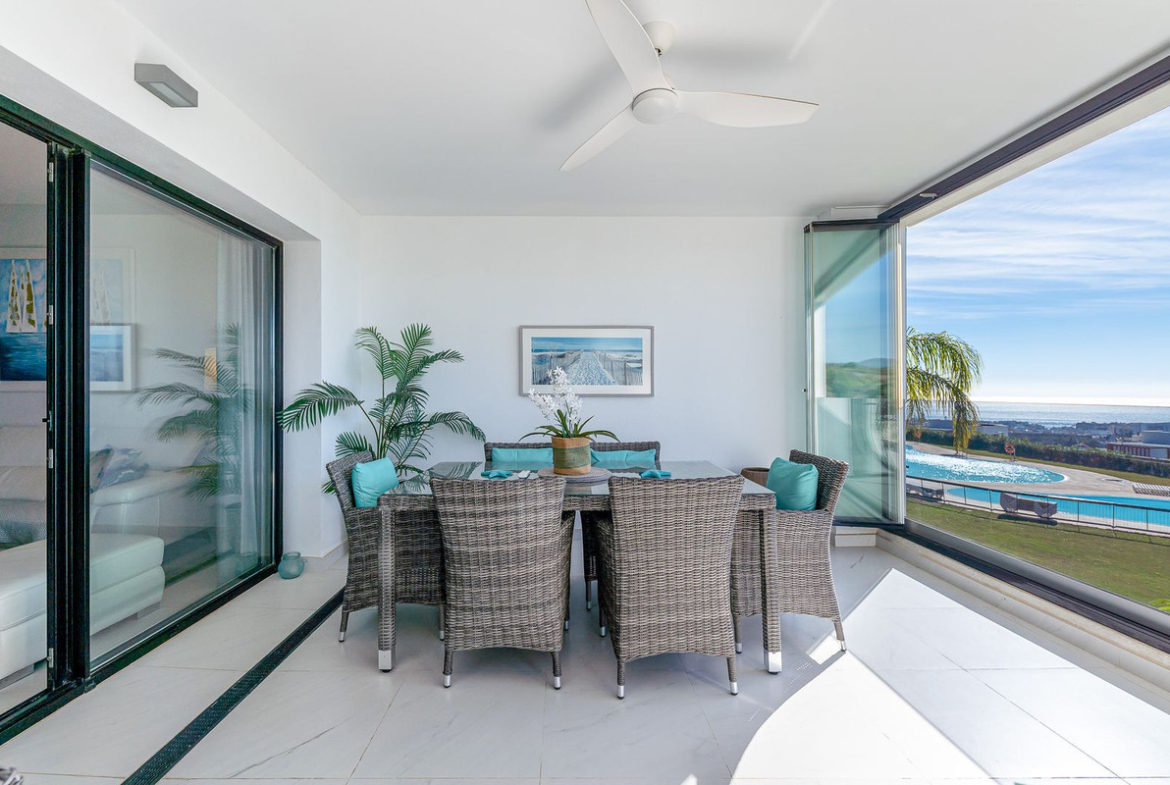 The bright and airy living/dining area opens onto a beautiful terrace with dining and lounge spaces, perfect for enjoying panoramic sea and mountain views. On clear days, you can even admire the spectacular silhouettes of Gibraltar and North Africa. With sunshine all day long, it’s ideal for year-round living: enjoy sunrises over Estepona town and unforgettable sunsets over the mountains.
