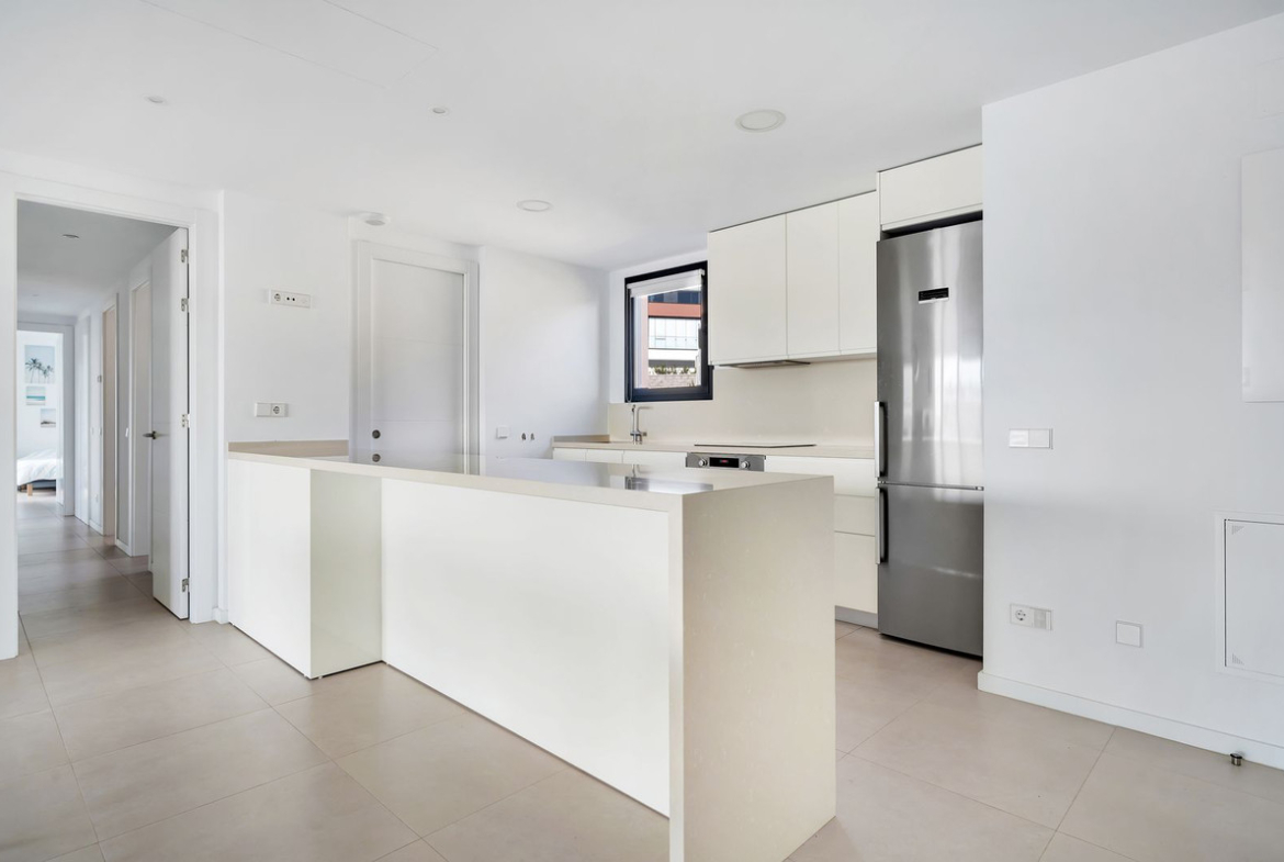 The bright living room leads to a large terrace of 40m2, where you can enjoy your morning coffee or a glass of wine at sunset, while looking out over the shimmering waves of the sea. The open kitchen, equipped with all comforts such as fridge, freezer, induction and oven, makes it perfect for daily meals or receiving guests.