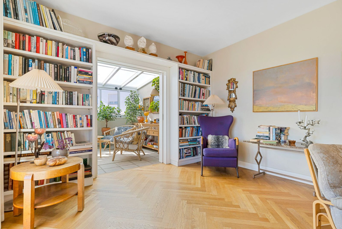 From the living room, there are three separate exits to the impressive south-facing terrace of 64 m² – a true oasis that enjoys sunshine throughout the day. The terrace is tastefully divided into several areas: