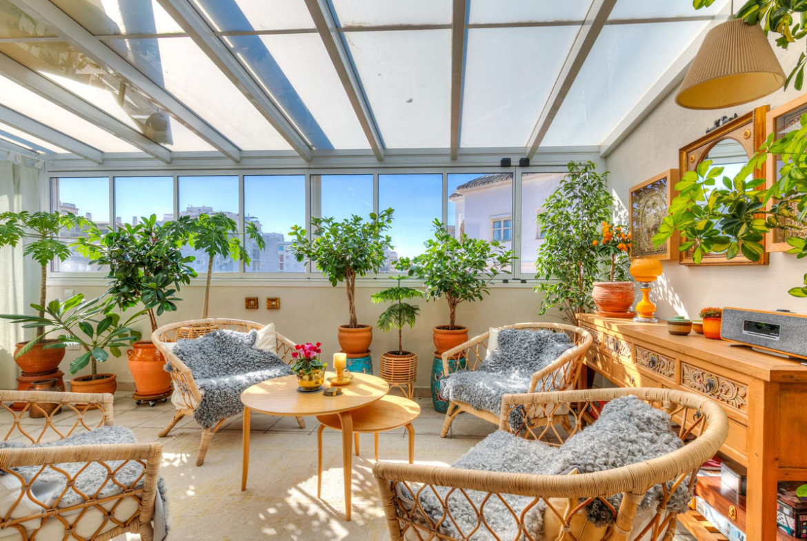 Welcome to this unique and bright single-level penthouse with a total built area of 174 m², ideally located in the very heart of Fuengirola. Here you enjoy an unbeatable location within walking distance of the marina, shops, restaurants and all amenities. The train and bus stations are just a few metres away, and the beautiful sandy beach can be reached in approximately 400 metres. The property offers a well-thought-out layout and a wonderful sense of space and light throughout. You are welcomed by a generous entrance hall, with the master bedroom located to the left, featuring a large en-suite bathroom with walk-in shower. Further into the apartment, there is a guest toilet and an impressive living area with an open-plan layout connecting seamlessly to an exclusive Danish-designed kitchen of the highest quality. A spacious dining area makes this space ideal for social gatherings. In a separate section of the living area, you will find a charming lounge room that was previously part of the terrace and is now fully enclosed with glass. This room extends the living season and creates a natural transition between indoor and outdoor spaces. From here, double doors also lead out to the terrace.