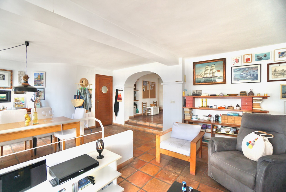 Have you dreamt of an Apartment with a spacious terrace and panoramic views to the Sea and the Peñon de Ifach, then this is your chance! The apartment consists of two floors connected by an indoor staircase, which can be entered from street level or directly via the main level. The communial outside staircase leads to the front-door to enter the spacious private terrace and you are immediately overwhelmed by the turquoise water of the Mediterranean Sea and the impressing and wide views right in front of you! Here you can enjoy the sun all day long and watch the boats go by. Large windows open onto the bright living-dining room in old Ibiza style with Terracotta flooring. Further on this level you will find a first smaller room or office, the separate kitchen, a bathroom with bathtub and a double bedroom with a built-in wardrobe.On the lower floor you find 2 more bedrooms and access to the Patio with a lot of potential. Here you can create your own private oasis with plants etc. or convert it into a parking space. Finally, there is also a separate toilet, an outside shower and a laundry room with boiler. It is also possible to use the downstairs area for commercial premises.This Apartment is located in a unique location and one could turn this into a Jewel after a reform.