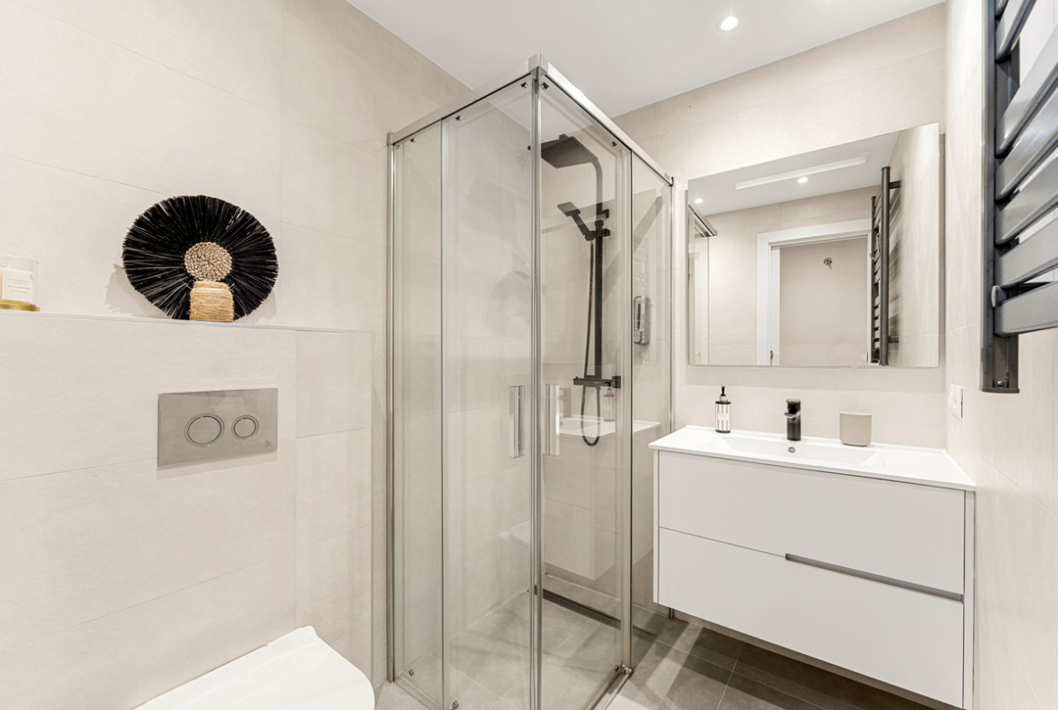 The apartment features four bedrooms and three en-suite bathrooms within 86 square meters of interior space. The open-plan living area is smartly designed to maximise functionality, connecting effortlessly to a generous 61 square meter terrace that serves as an ideal extension of the home. Whether enjoying family meals, entertaining friends, or simply relaxing outdoors, this space enhances the property’s lifestyle appeal. Natural light floods the interiors through large sliding doors, while details such as electric blinds, a fully equipped Balay kitchen, and high-quality finishes add everyday convenience and style.