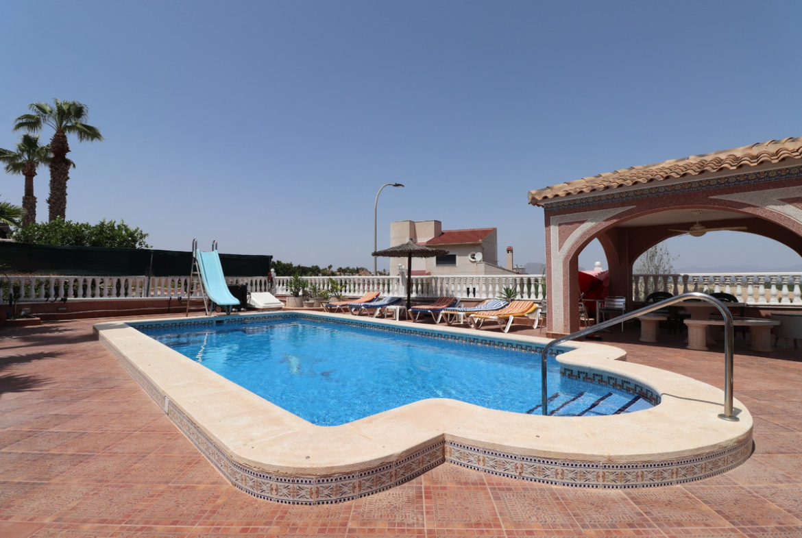 FANTASTIC OPPORTUNITY!!! – This Extremely Spacious, West Facing, Four Bedroom Detached Villa in Lomas de La Juliana is located on a prestigious Urbanization between Algorfa Village & La Finca Golf Resort, situated on a generous 1251m2 plot. This stunning property features four bedrooms and three bathrooms, including a luxurious master bedroom with an en suite bathroom that boasts a feature corner bath and shower. Both the master and the fourth bedroom have direct access to the first-floor terrace. Additionally, there is one toilet, off-road parking, a car port, and a garage. The villa offers a front glazed terrace where you can enjoy amazing panoramic country, mountain, and sunset views. The rear conservatory provides additional living space, while the open plan fully fitted kitchen comes with an adjoining utility room for added convenience. The spacious living area is equipped with air conditioning throughout, grills, a fireplace, and fitted wardrobes for ample storage. The exterior of the property is just as impressive, featuring a private heated swimming pool and a permanent gazebo for outdoor shaded dining, perfect for entertaining guests. There is also a BBQ area and a beautifully landscaped rear garden with terraces, trees, shrubs, and plants. The property includes 8 solar panels and 1 solar water panel, contributing to its energy efficiency. Security is a priority with CCTV and an alarm system installed. This villa's location offers the best of both worlds – a tranquil setting with a tennis club at the start of the urbanization, yet only a 5-minute drive to the nearest shops and amenities, and a 15-minute drive to the nearest beaches. This property truly represents a luxurious lifestyle in the heart of Costa Blanca South. 412m2 Build Size, Simply Wow!!!