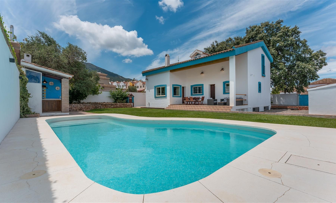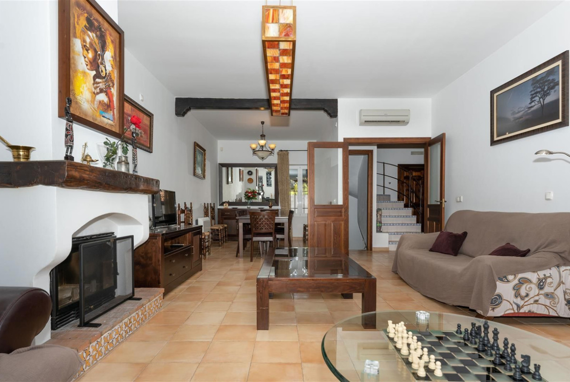 An extremely well presented traditional Andalusian style property, with modern fixtures, situated on a popular urbanisation on the outskirts of Alhaurin el Grande. Gates welcome you into a spacious courtyard with parking for several cars, sheltered by a 300-year-old oak tree. The property is set back from the road offering extended privacy. A traditional Andalusian door, with dark beamed frames welcomes you into the main hallway with open staircase and high ceilings. To the right, you will find double doors leading you to a large reception room with enough space for a dining table. A feature fireplace and traditional beam add more character to this wonderful room. From here you can access the outside dining terrace overlooking the lawned garden and pool. The terrace is also accessible from the fully fitted kitchen. Returning to the main entrance hall, you will find a double bedroom and bathroom to the left as well as a utility room set off from the kitchen. The open staircase leads you to the first with three double bedrooms as well as a family bathroom, with separate shower and roll top bath. The basement has been converted into a spacious games room with wet room and storage room.