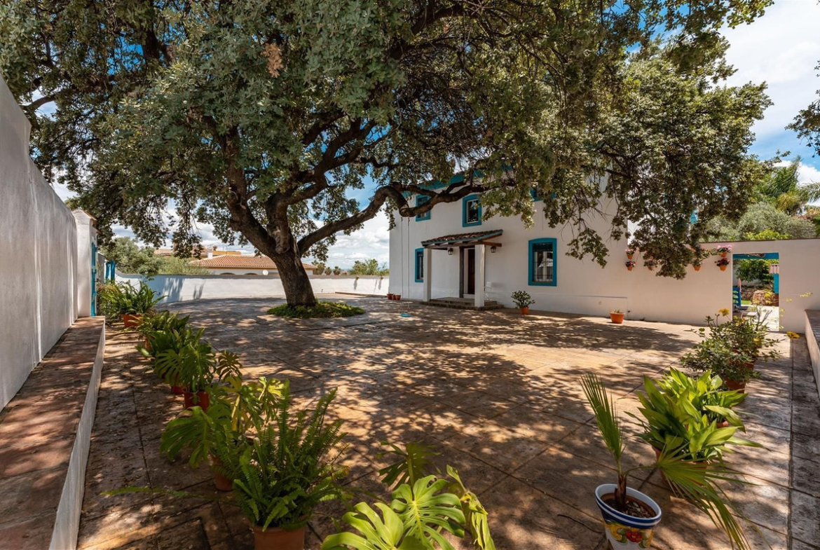 An extremely well presented traditional Andalusian style property, with modern fixtures, situated on a popular urbanisation on the outskirts of Alhaurin el Grande. Gates welcome you into a spacious courtyard with parking for several cars, sheltered by a 300-year-old oak tree. The property is set back from the road offering extended privacy. A traditional Andalusian door, with dark beamed frames welcomes you into the main hallway with open staircase and high ceilings. To the right, you will find double doors leading you to a large reception room with enough space for a dining table. A feature fireplace and traditional beam add more character to this wonderful room. From here you can access the outside dining terrace overlooking the lawned garden and pool. The terrace is also accessible from the fully fitted kitchen. Returning to the main entrance hall, you will find a double bedroom and bathroom to the left as well as a utility room set off from the kitchen. The open staircase leads you to the first with three double bedrooms as well as a family bathroom, with separate shower and roll top bath. The basement has been converted into a spacious games room with wet room and storage room.