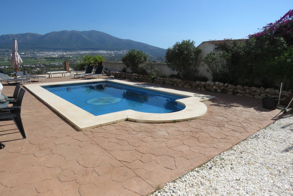 Great house with amazing mountain views. The property consists of 4 bedrooms and 3 bathrooms of which1 bedroom and bathroom is on the main level, the other 3 bedrooms and 2 bathrooms are on the 1st floor. The master bedroom comes with en-suite bathroom and leads out onto a nice sized terrace with incredible open views of the countryside. It has its own private swimming pool, BBQ area and children's playground. The outdoor space is tiled and easily maintained. Furthermore there is a large two car garage. Must be seen to appreciate and well worth viewing !!!